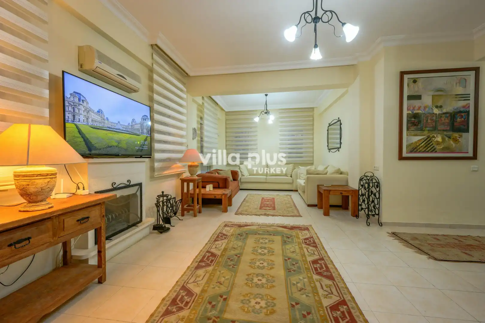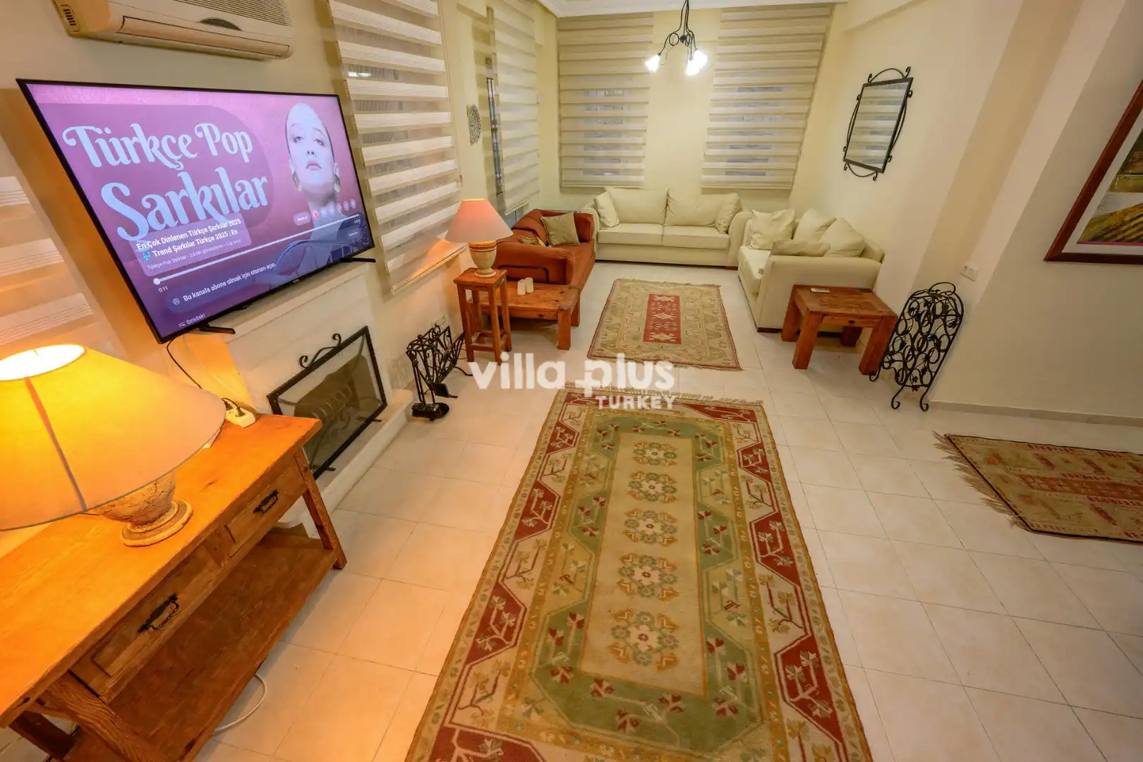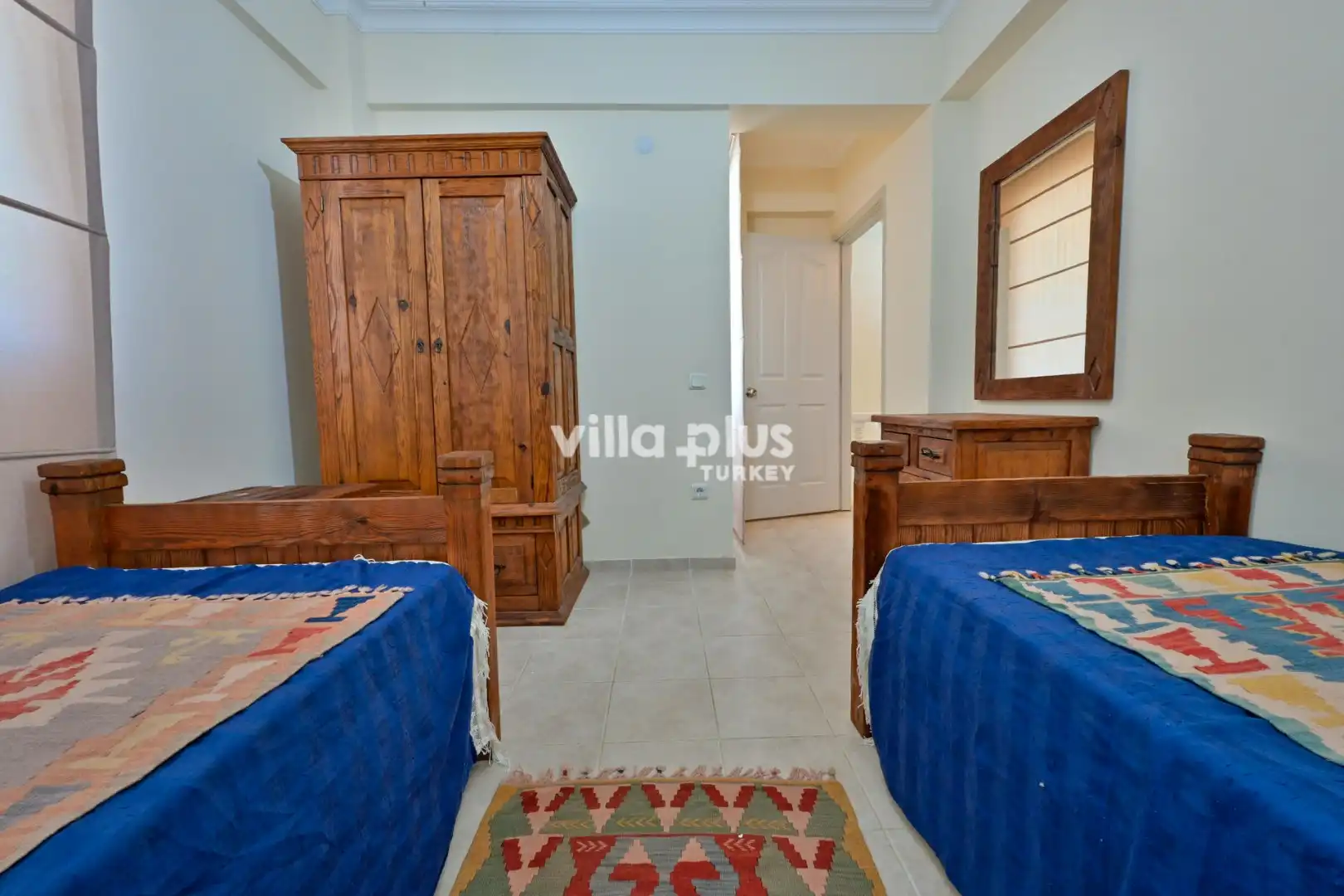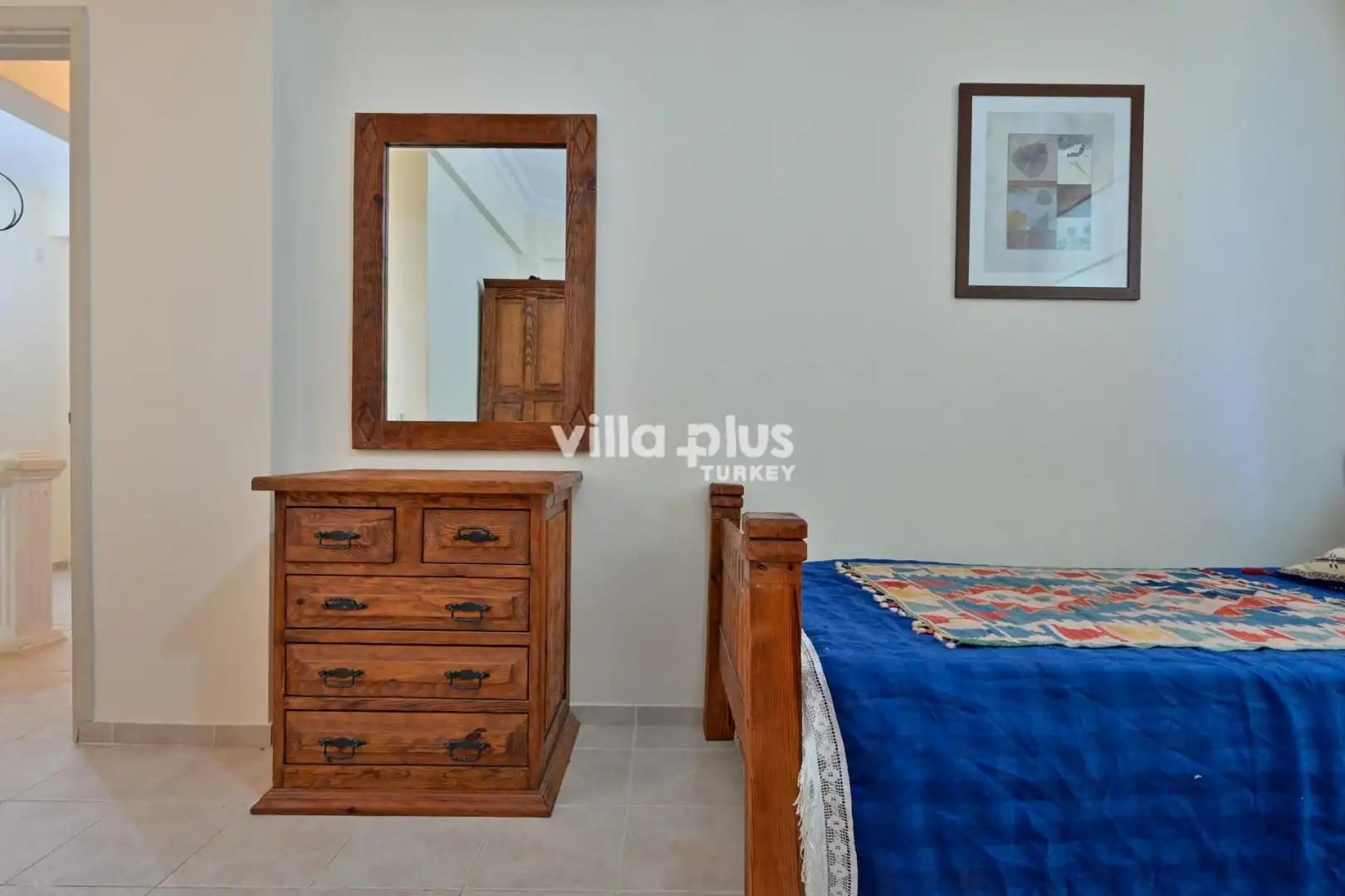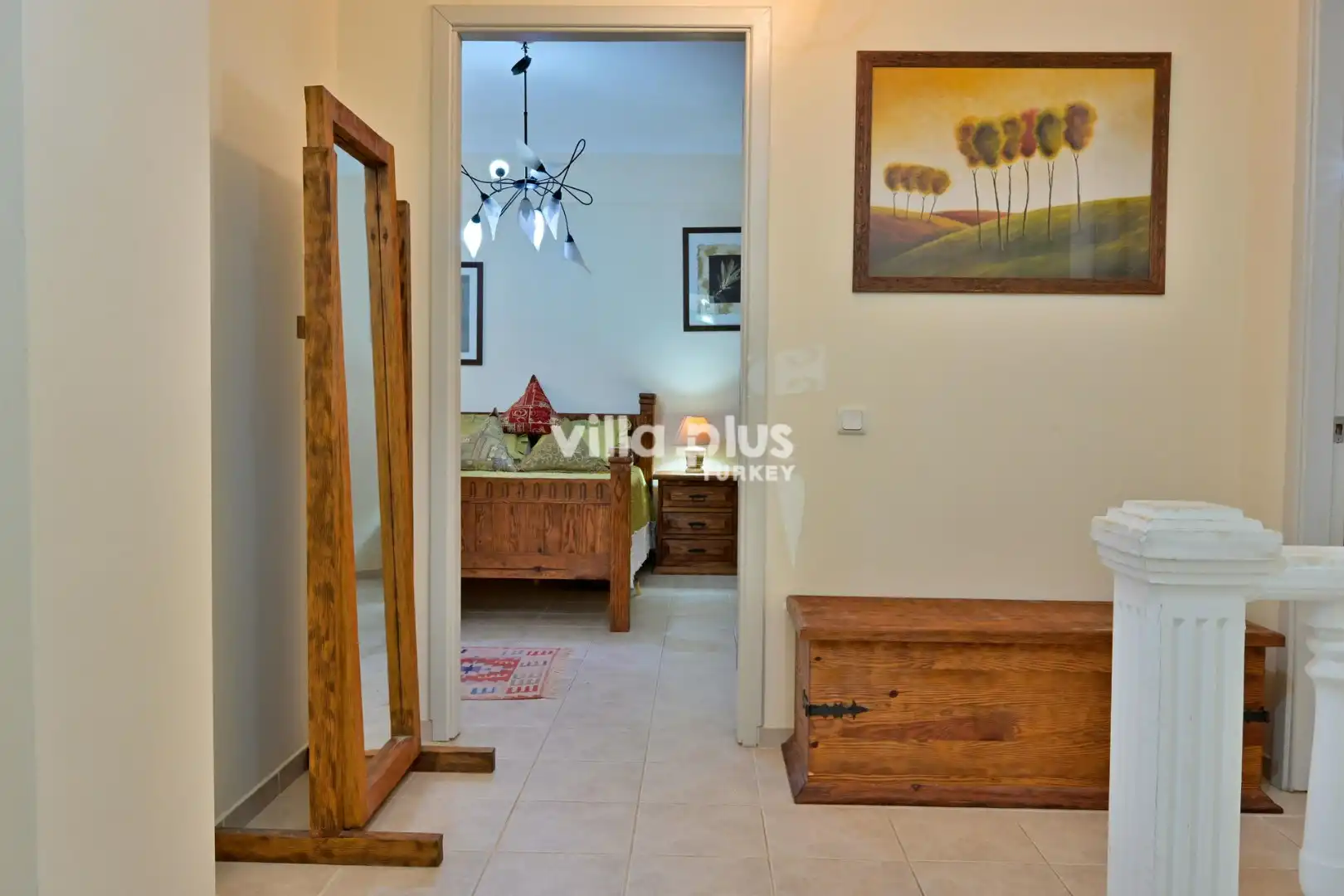 The villa features a total of three bedrooms, and the living room on the lower floor includes a special sofa that can be converted into a double bed if needed. This allows the villa to comfortably accommodate up to 8 guests. Its spacious and airy living areas create an ideal environment for both families and groups of friends.
