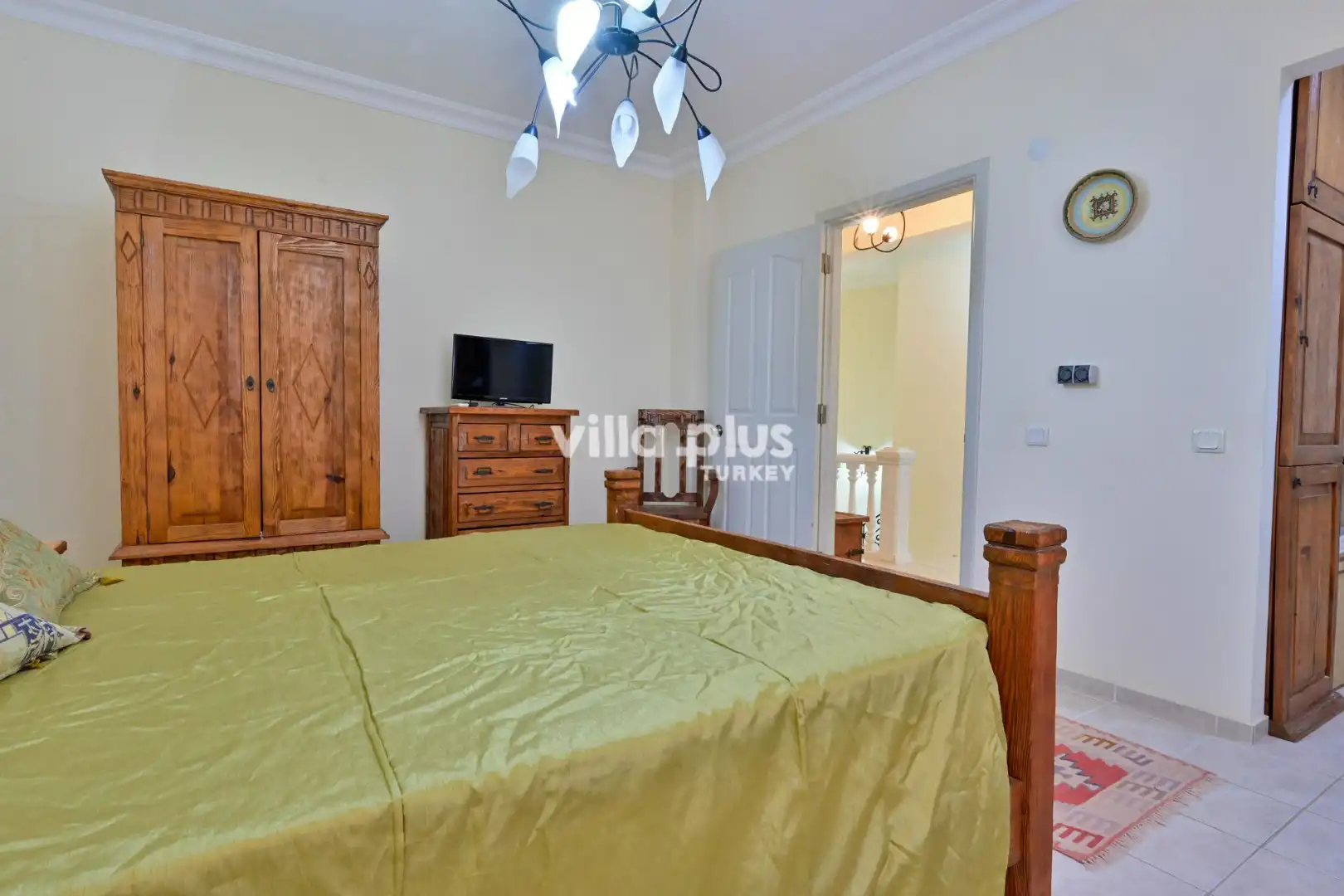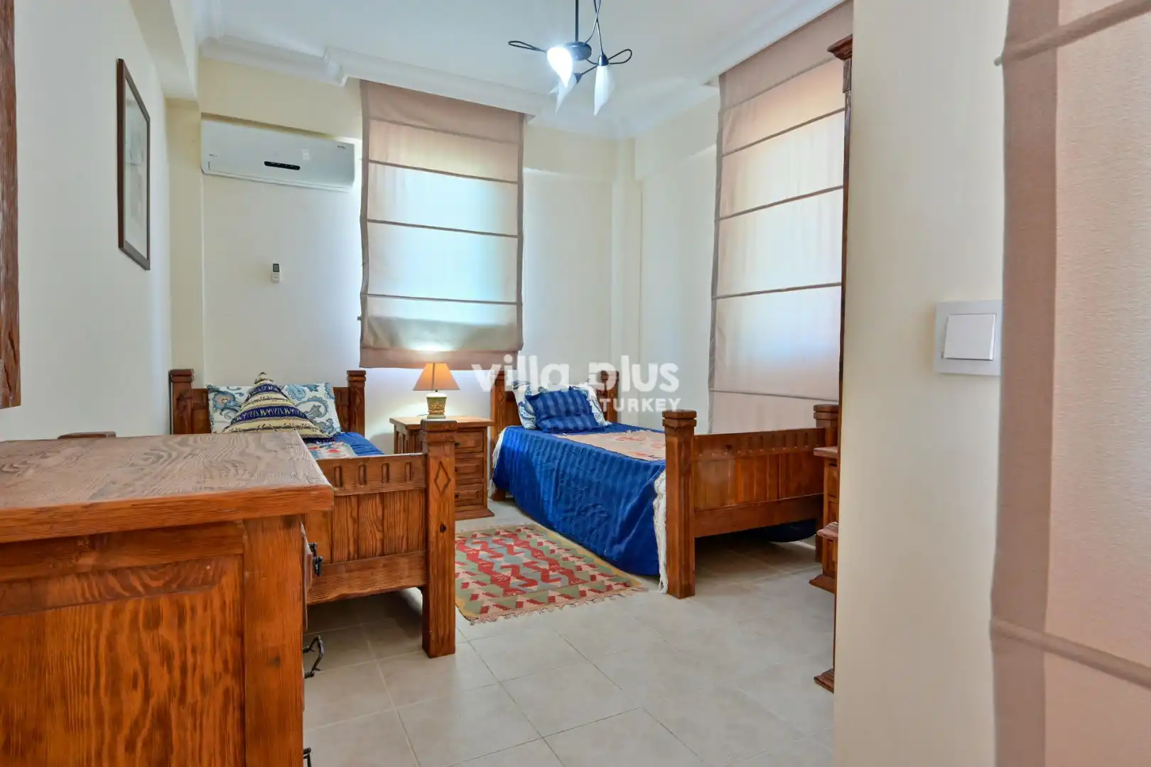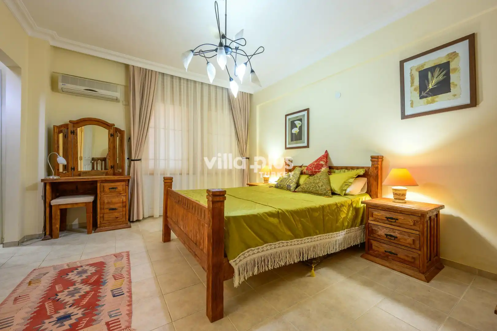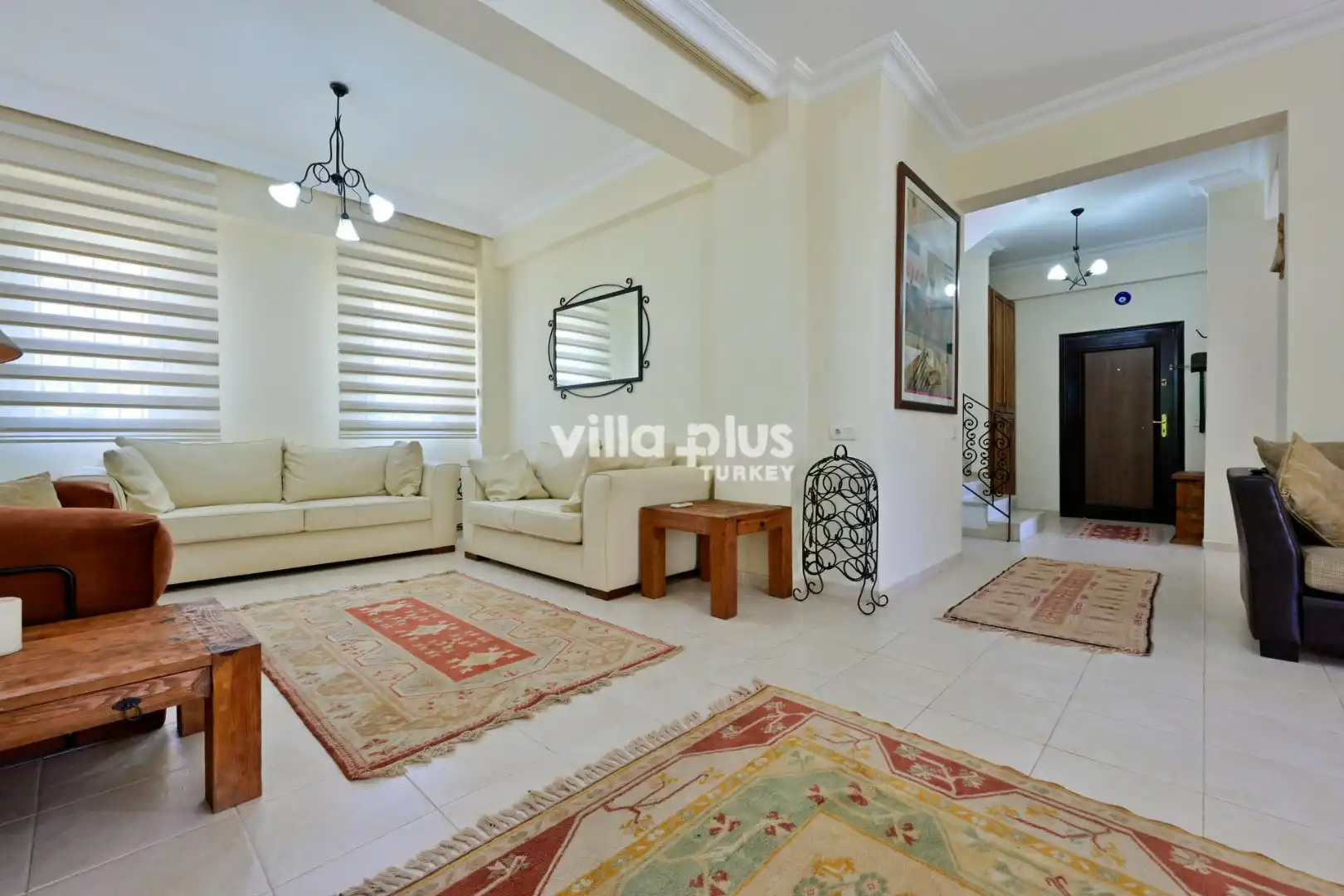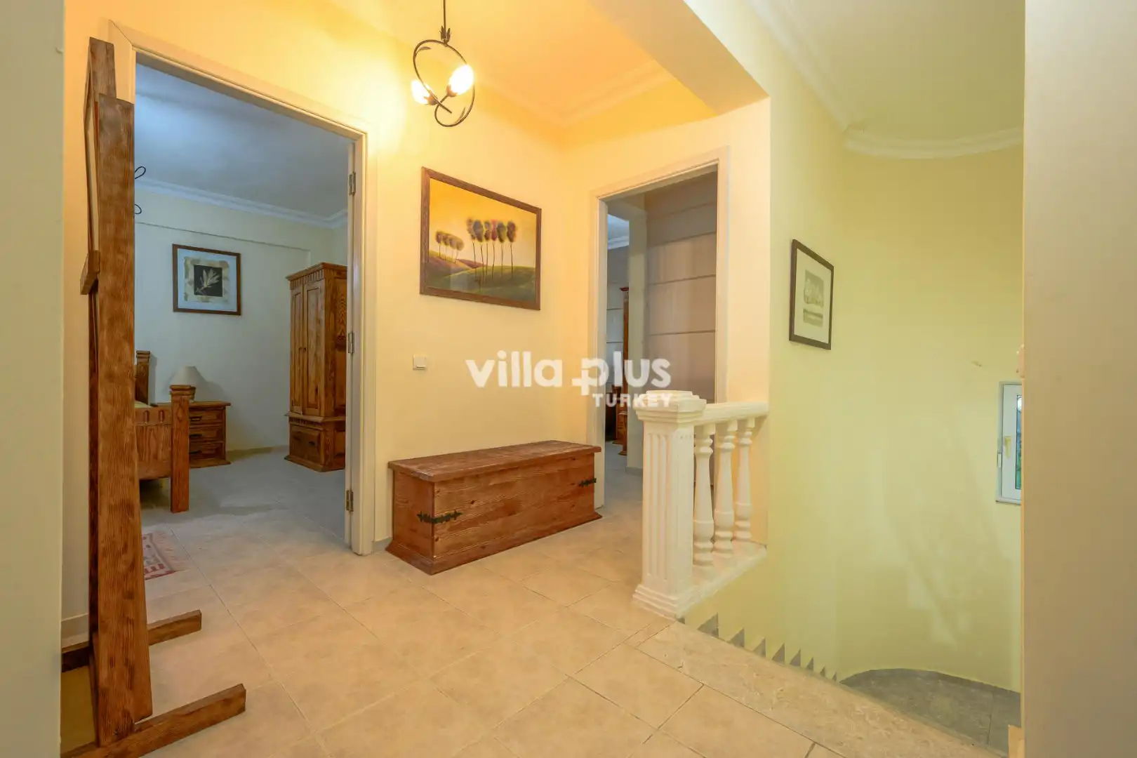 The villa features a total of three bedrooms, and the living room on the lower floor includes a special sofa that can be converted into a double bed if needed. This allows the villa to comfortably accommodate up to 8 guests. Its spacious and airy living areas create an ideal environment for both families and groups of friends.