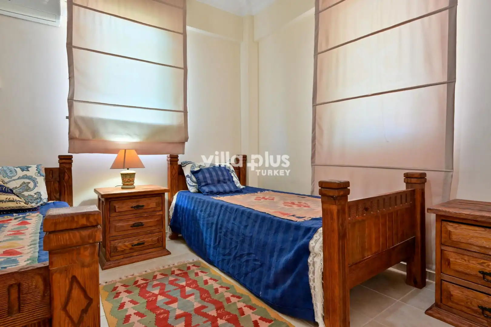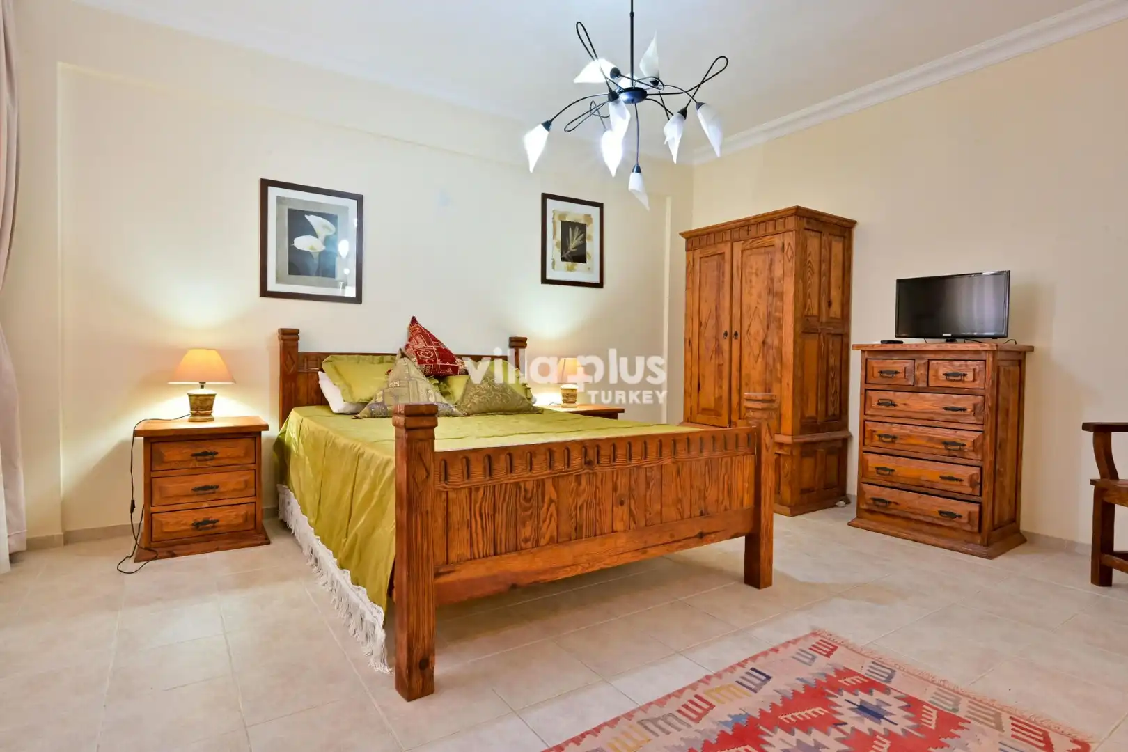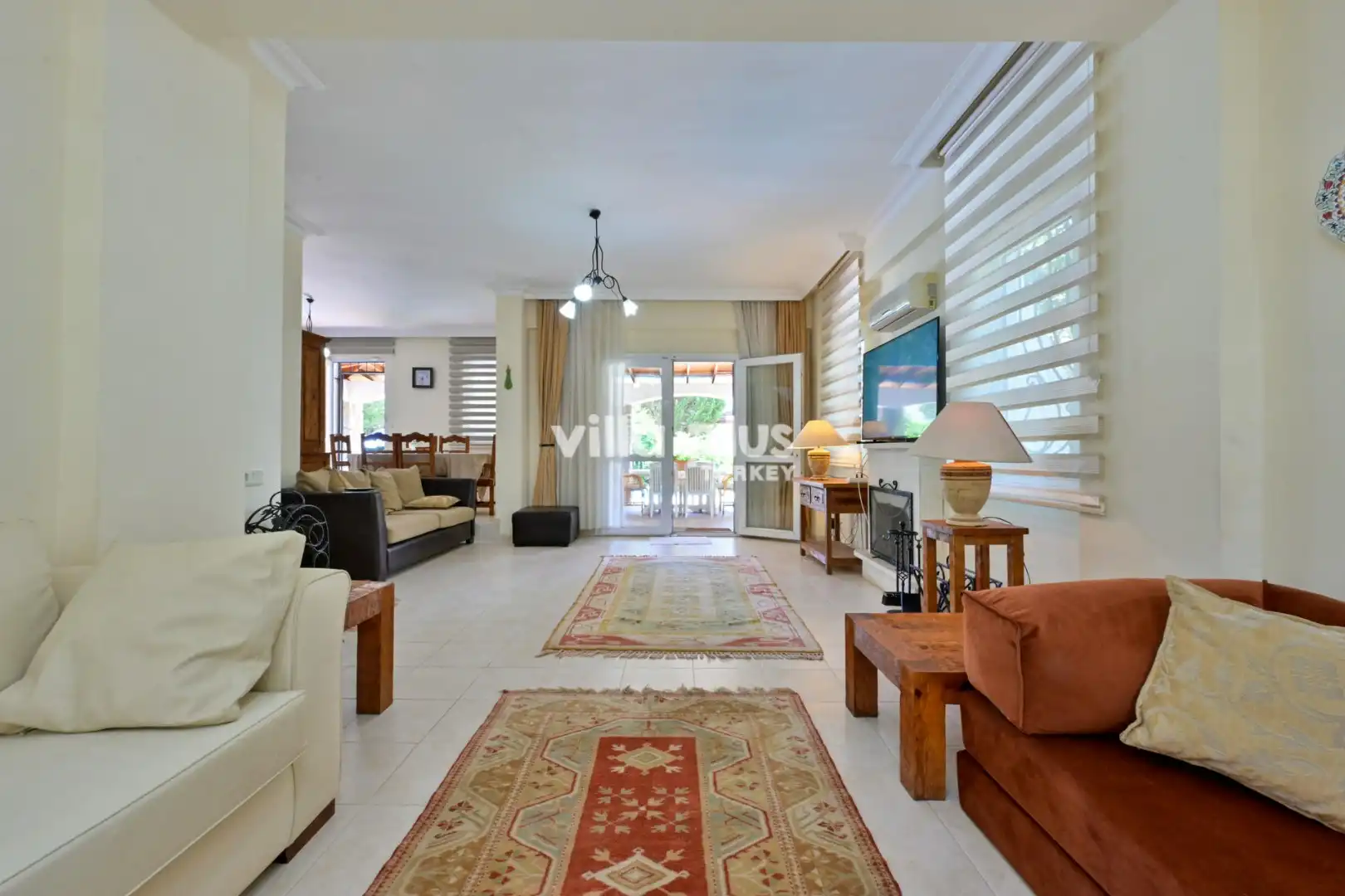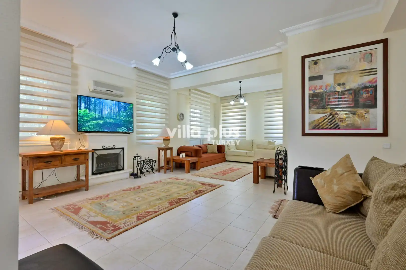 The villa features a total of three bedrooms, and the living room on the lower floor includes a special sofa that can be converted into a double bed if needed. This allows the villa to comfortably accommodate up to 8 guests. Its spacious and airy living areas create an ideal environment for both families and groups of friends.