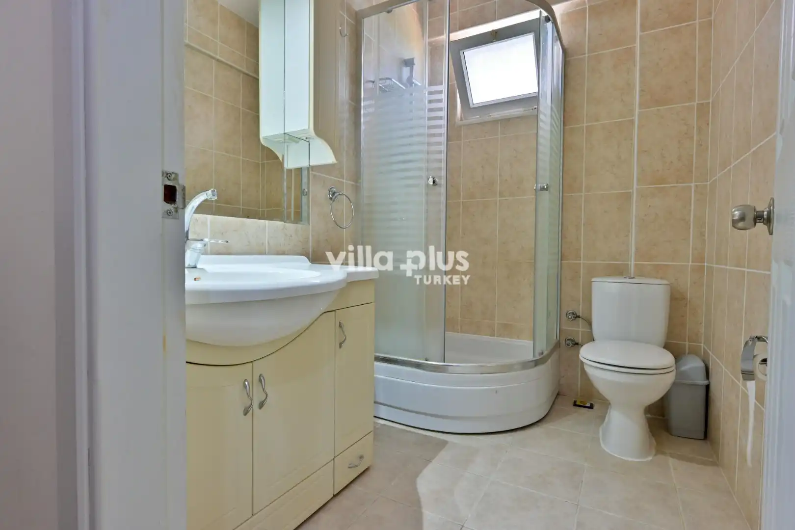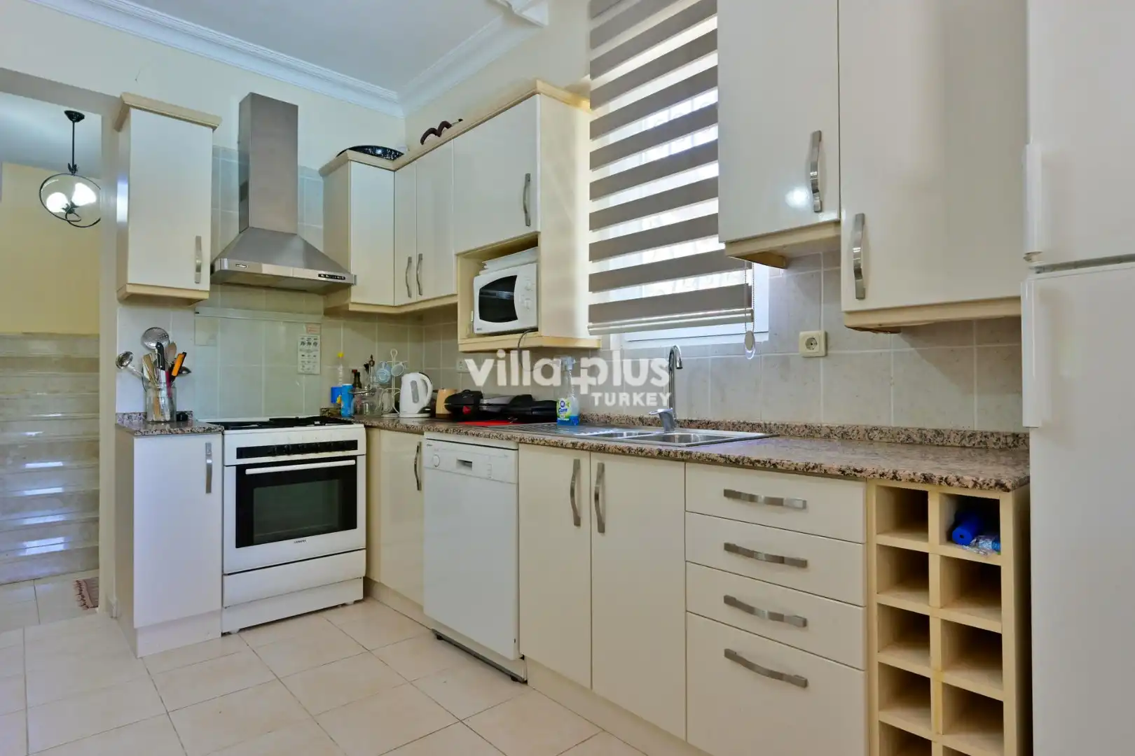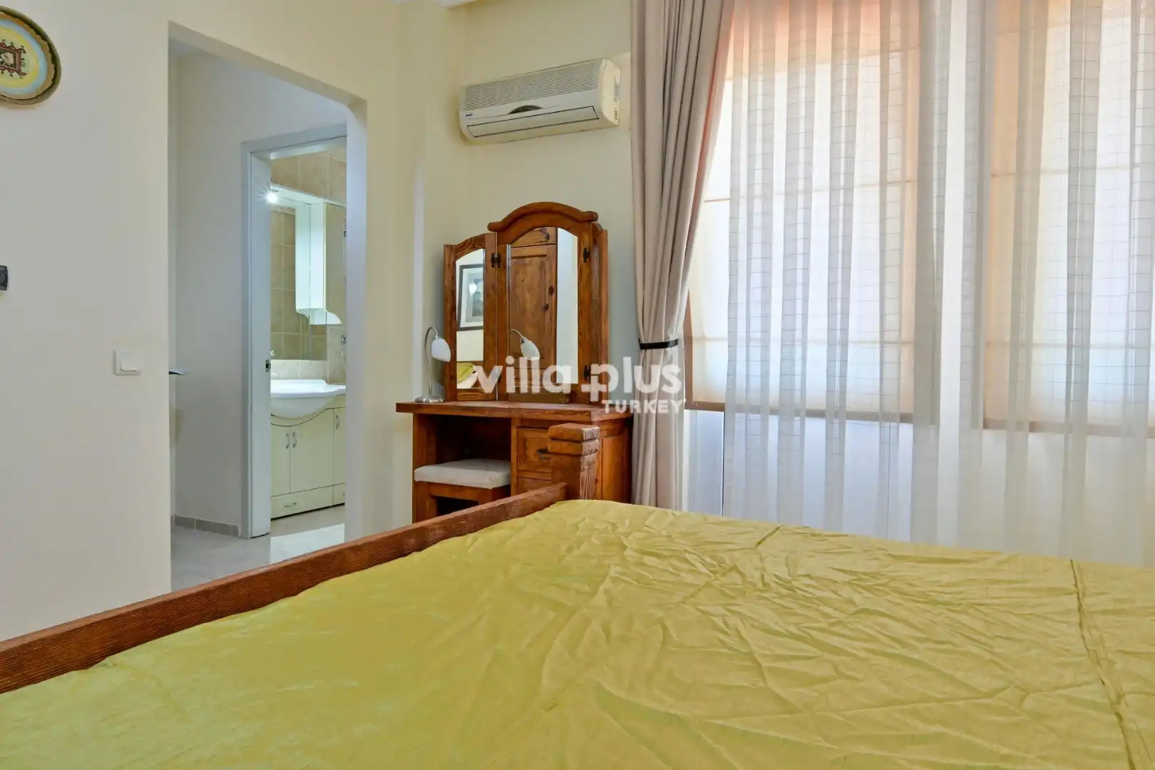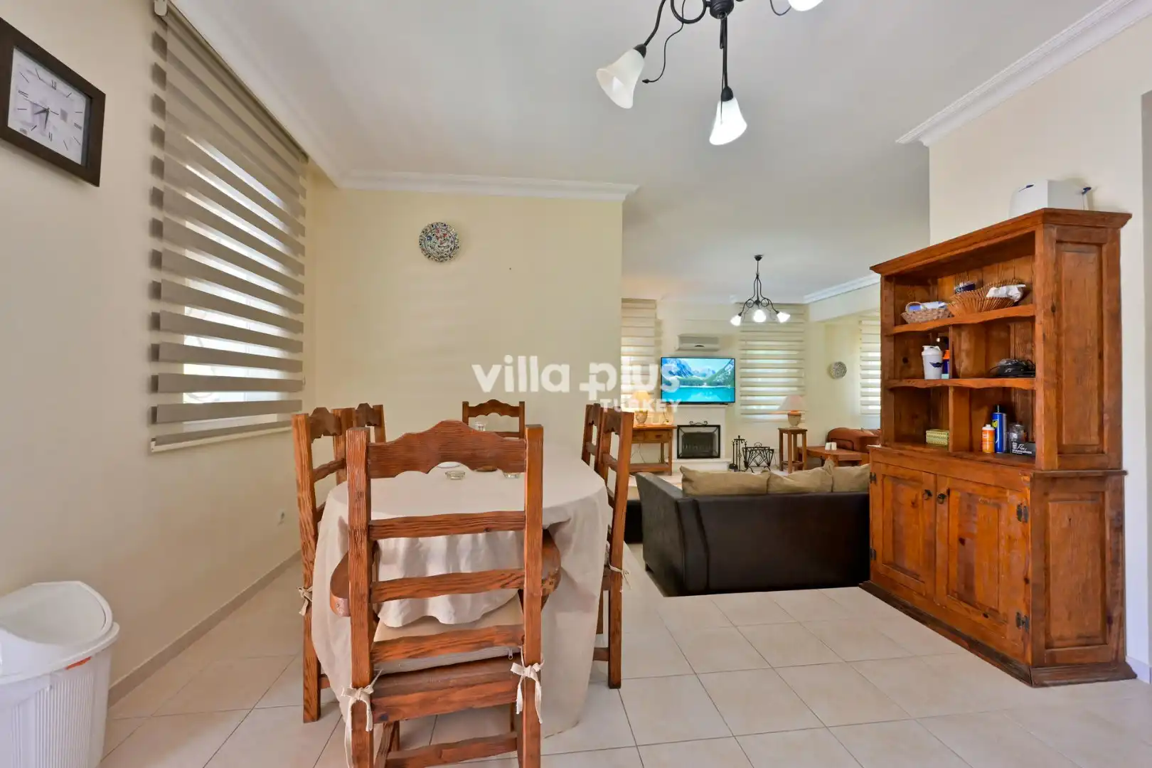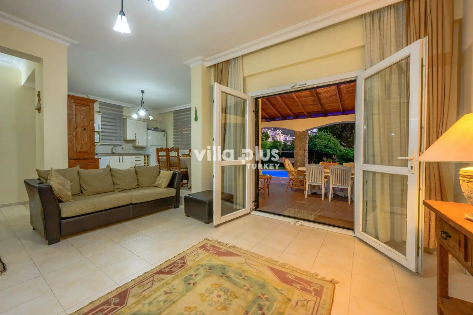 The villa features a total of three bedrooms, and the living room on the lower floor includes a special sofa that can be converted into a double bed if needed. This allows the villa to comfortably accommodate up to 8 guests. Its spacious and airy living areas create an ideal environment for both families and groups of friends.