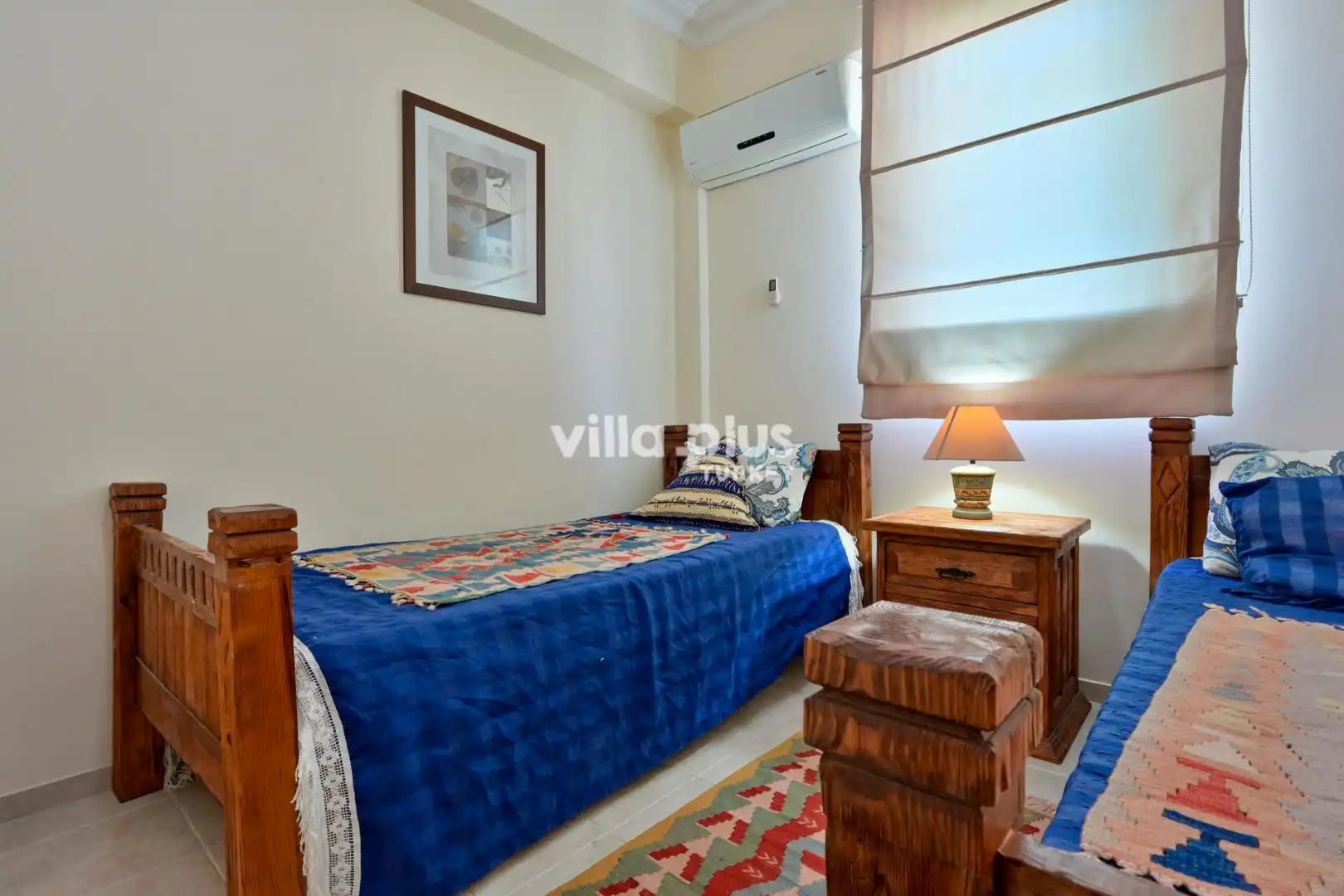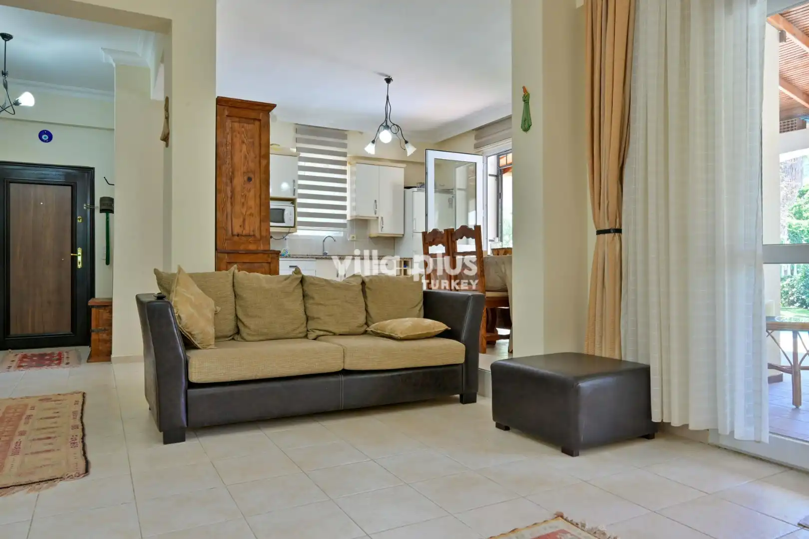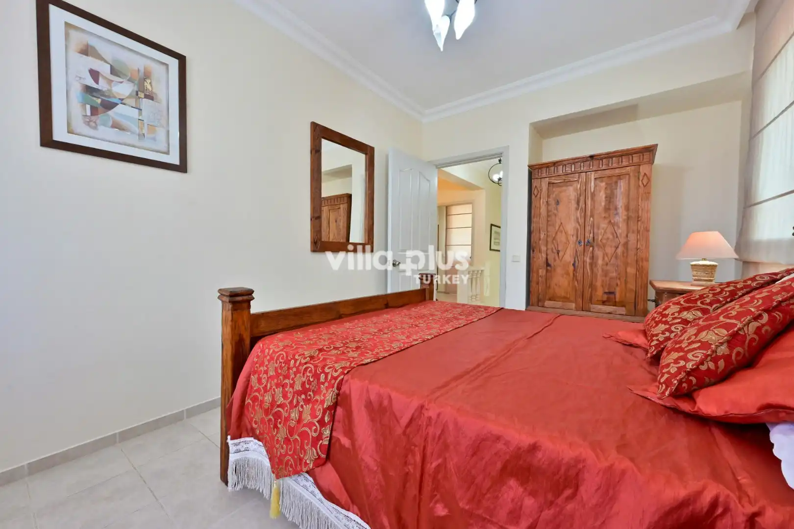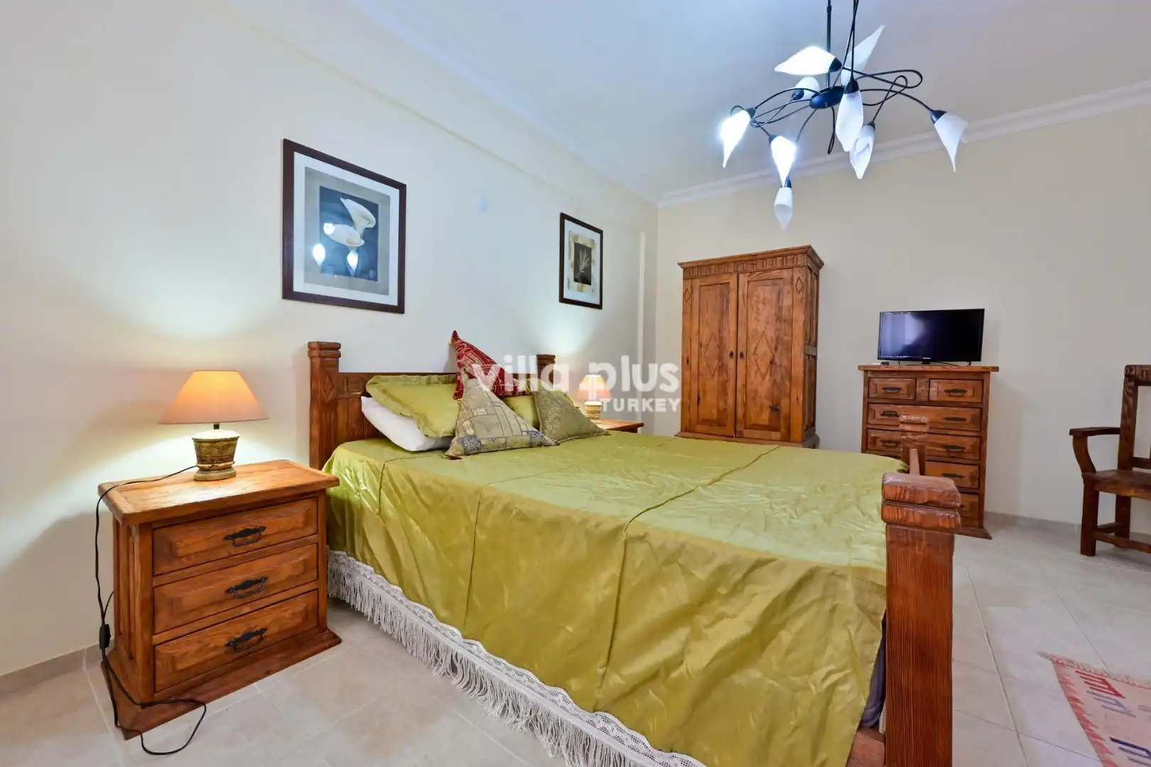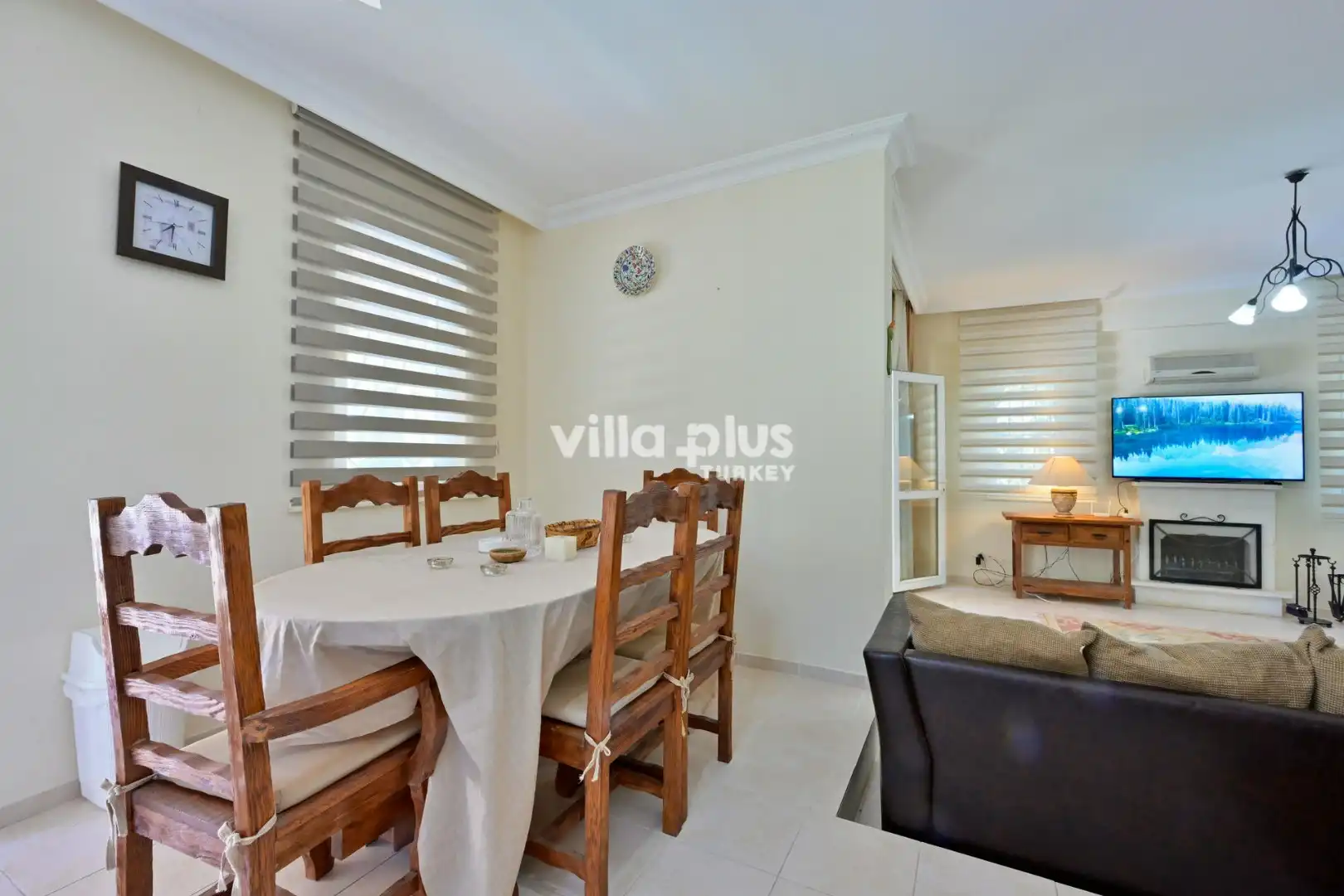 The villa features a total of three bedrooms, and the living room on the lower floor includes a special sofa that can be converted into a double bed if needed. This allows the villa to comfortably accommodate up to 8 guests. Its spacious and airy living areas create an ideal environment for both families and groups of friends.