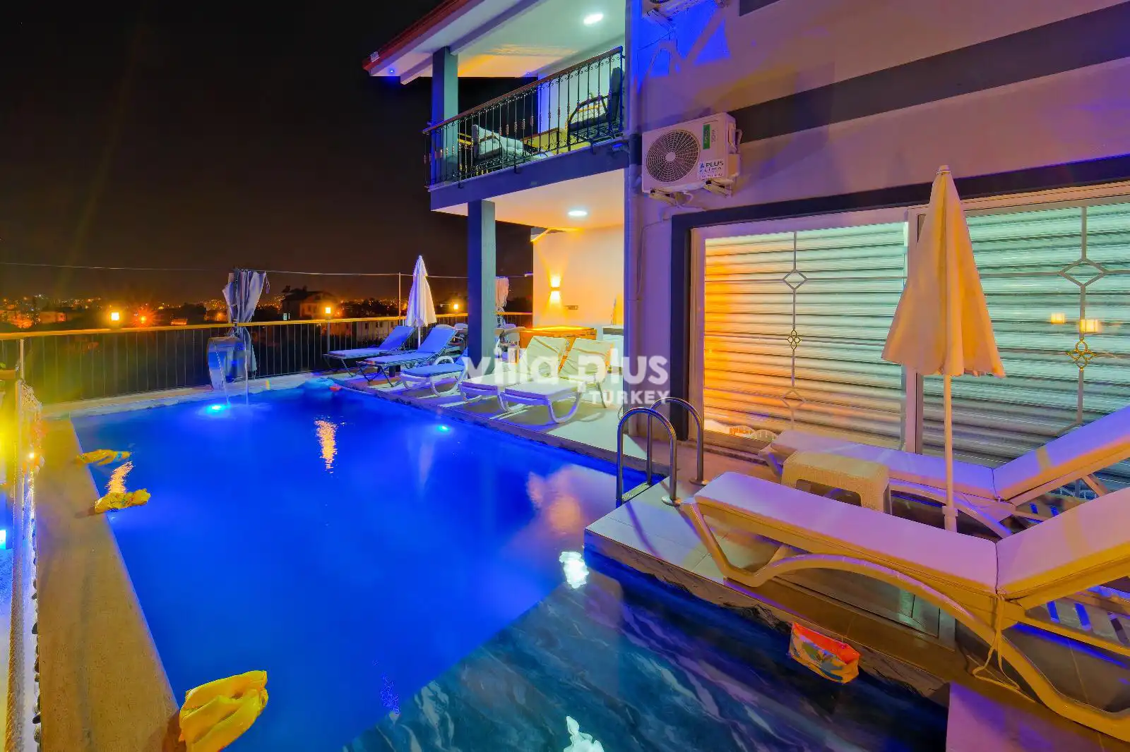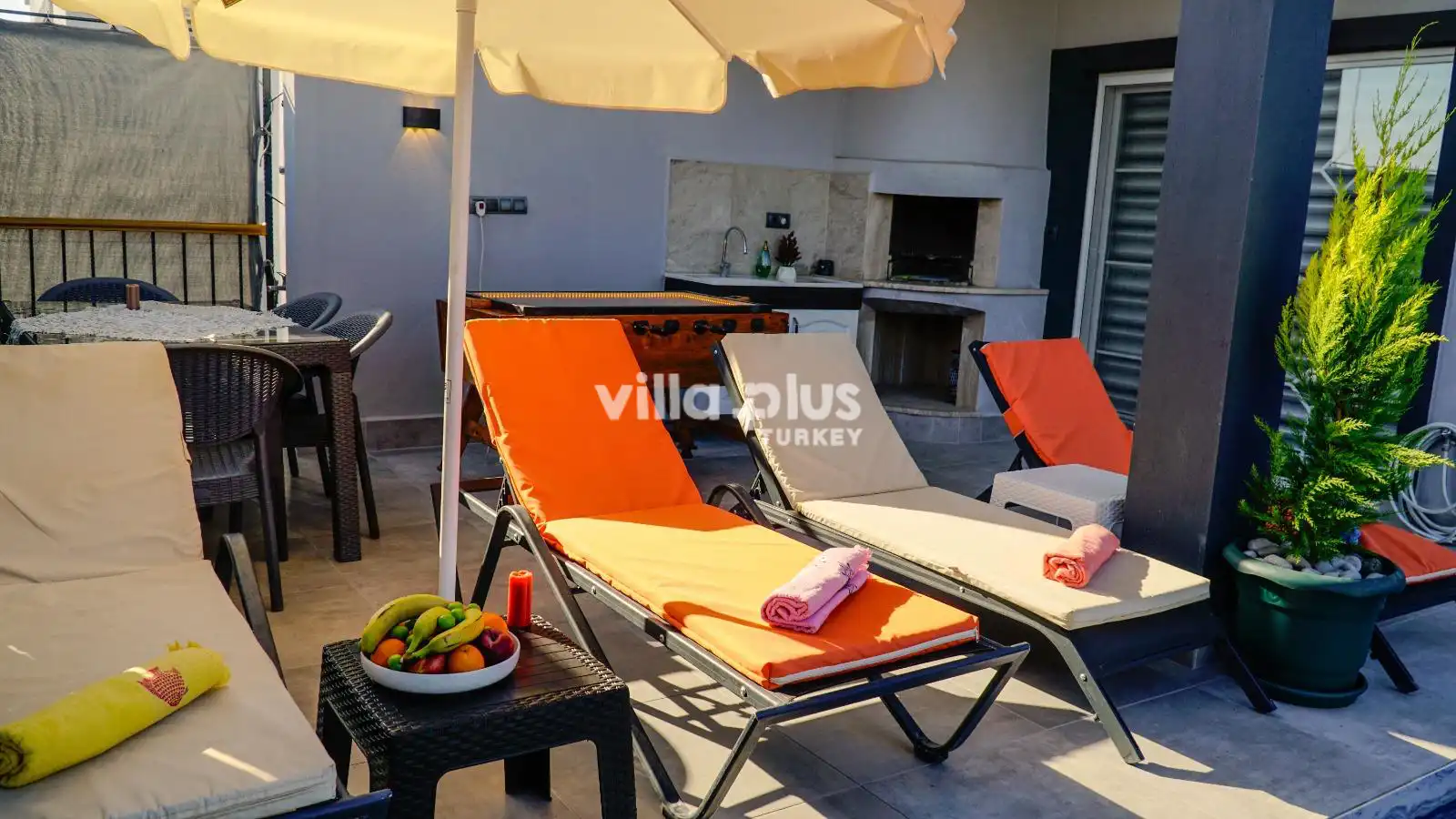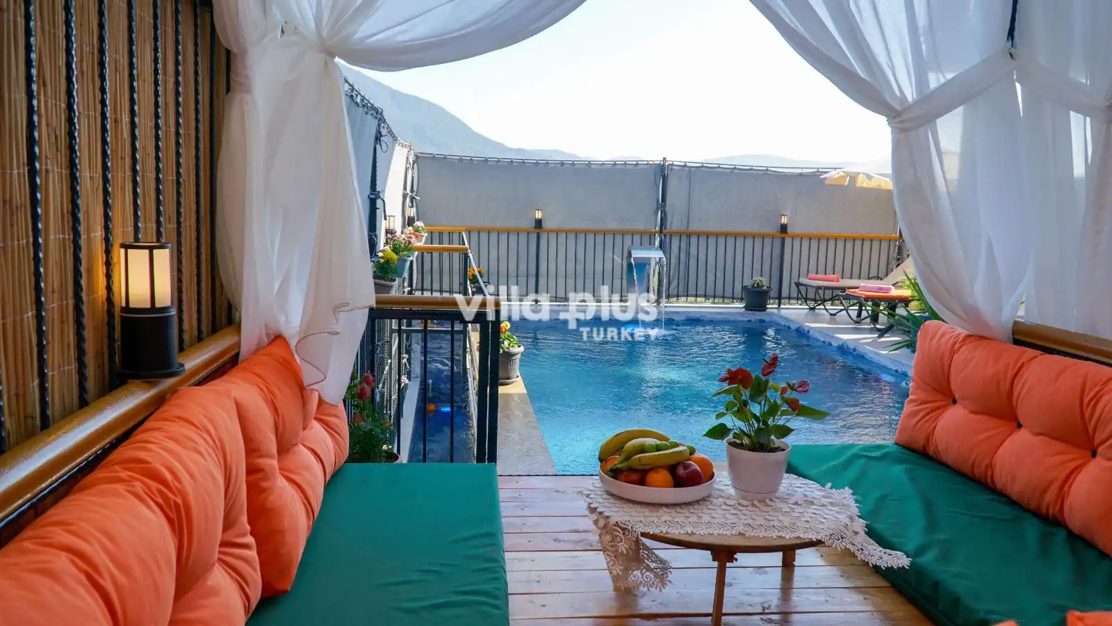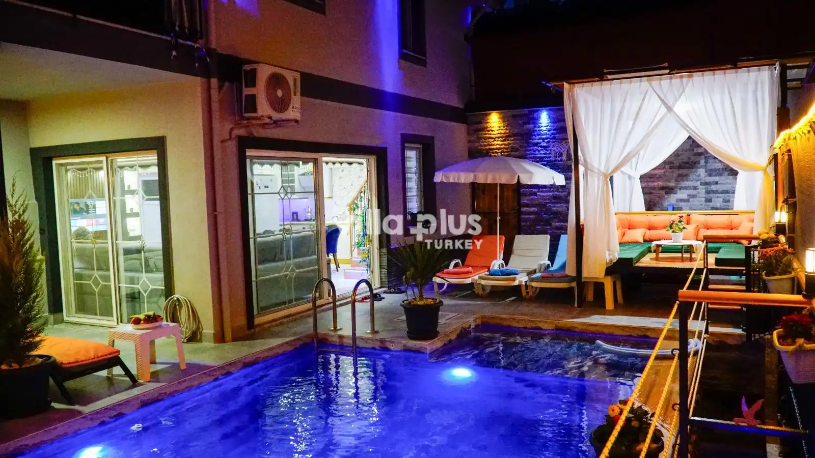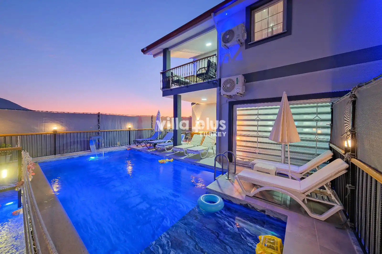 Villa Esin is a two-storey villa located in Fethiye, one of the distinguished holiday resorts of our country, attracting attention with its modern architecture. With 3 bedrooms and 2 bathrooms and toilets, our villa stands out as an ideal option for large families and crowded groups of friends with an accommodation capacity of 7 people with a children's bed. You can relieve the tiredness of the year with the jacuzzi in the pool area of our villa, and you can cool off in hot weather with the sheltered private swimming pool. Our villa with its private swimming pool, comfortable sun loungers and barbecue, indispensable for the summer months, awaits guests who want to spend a secluded and peaceful holiday.