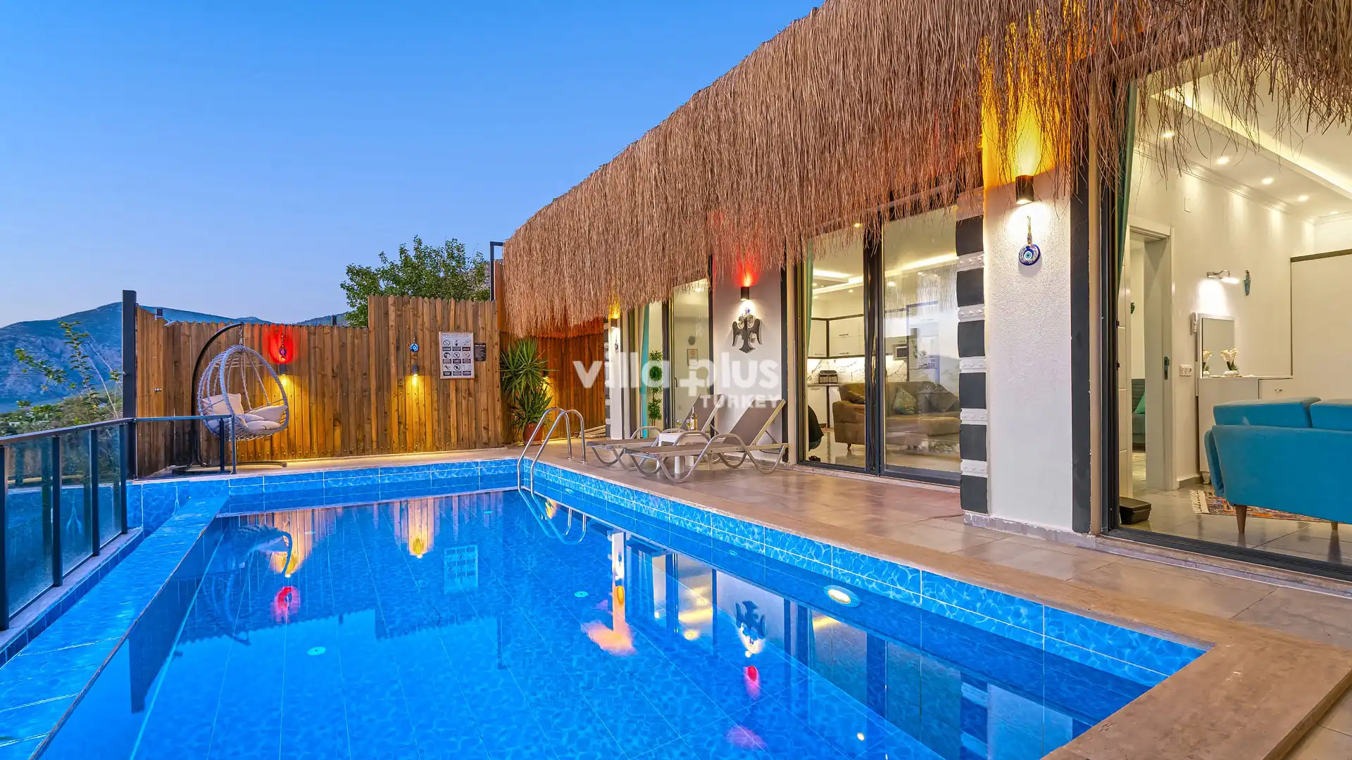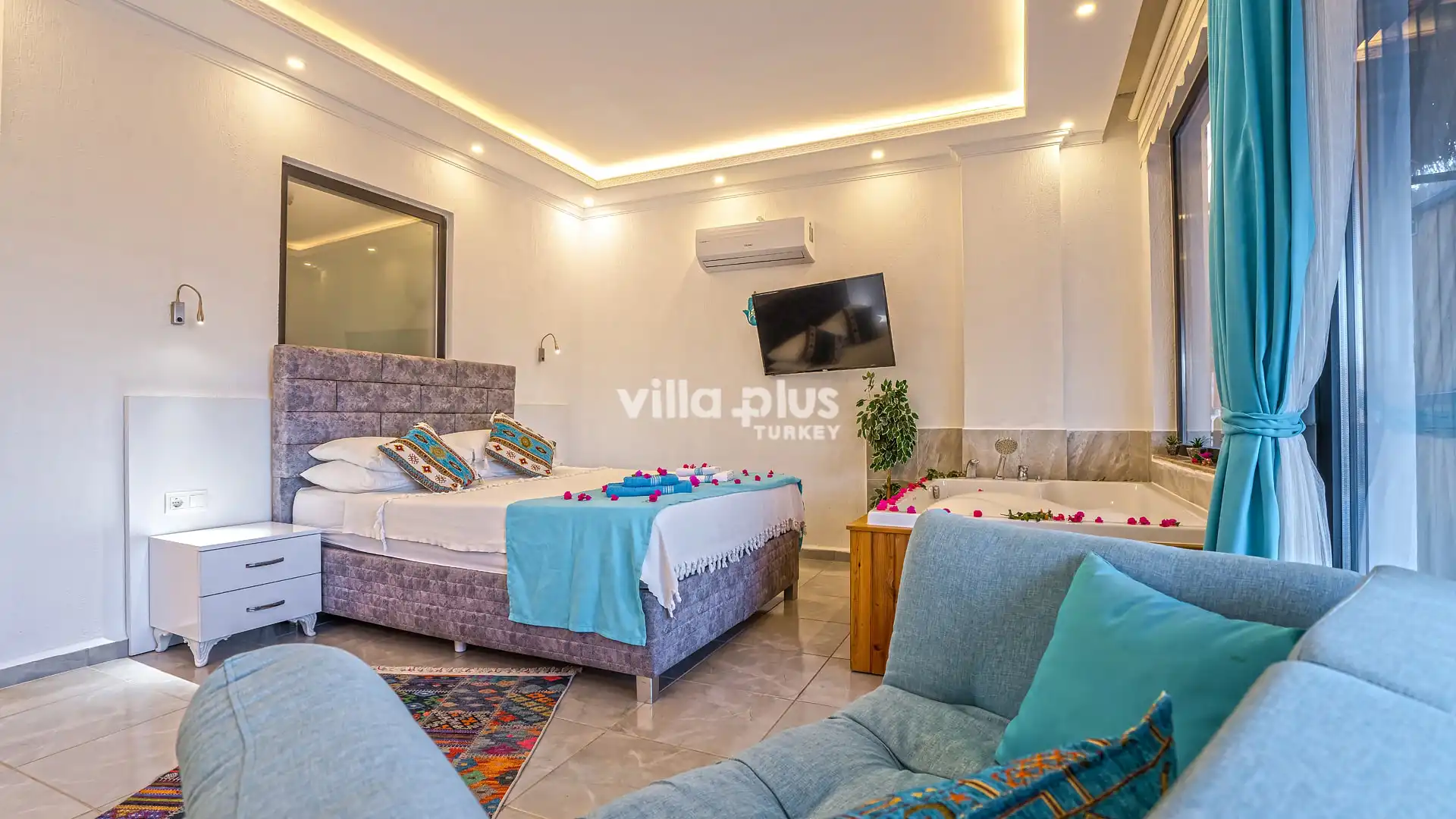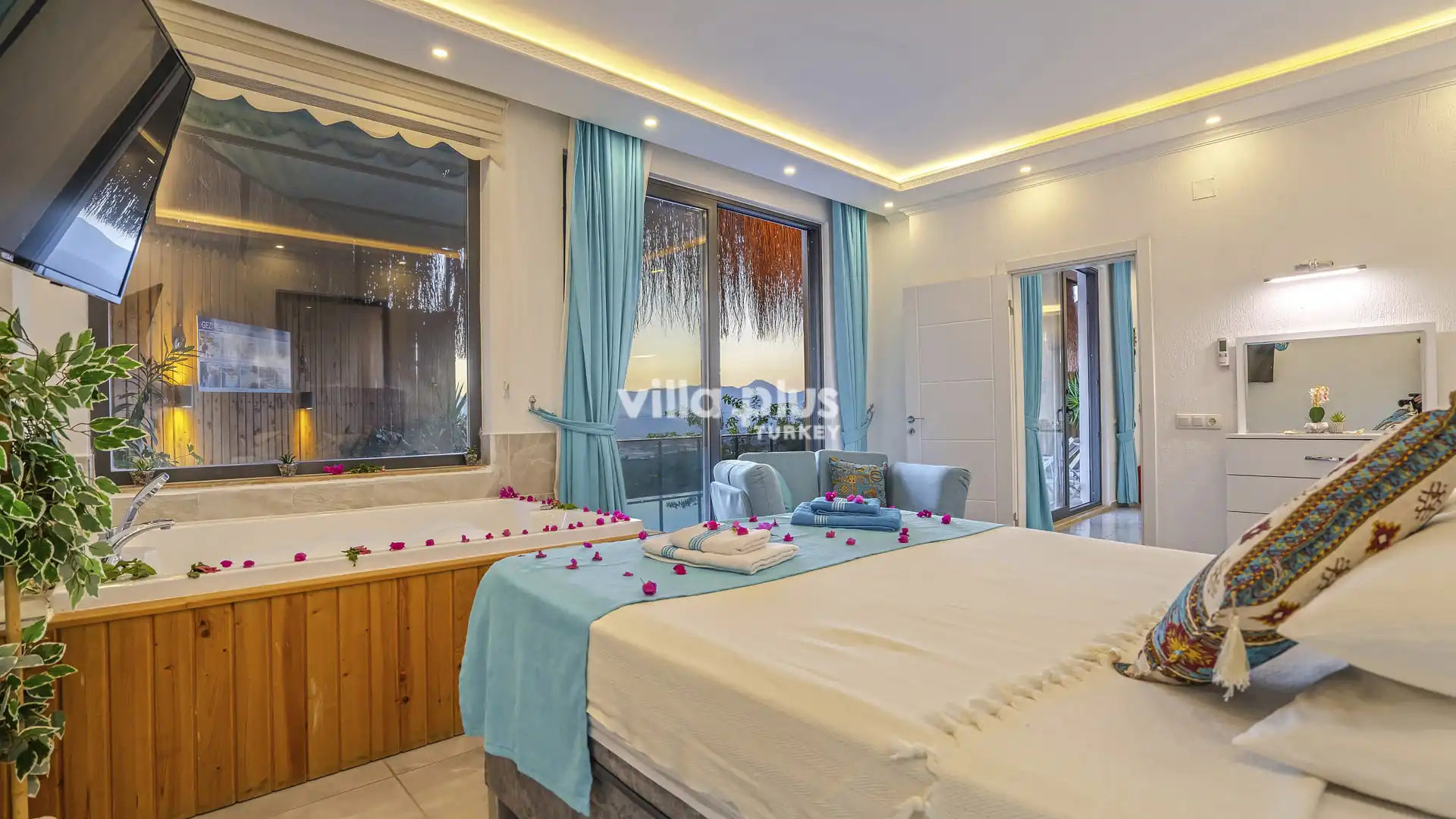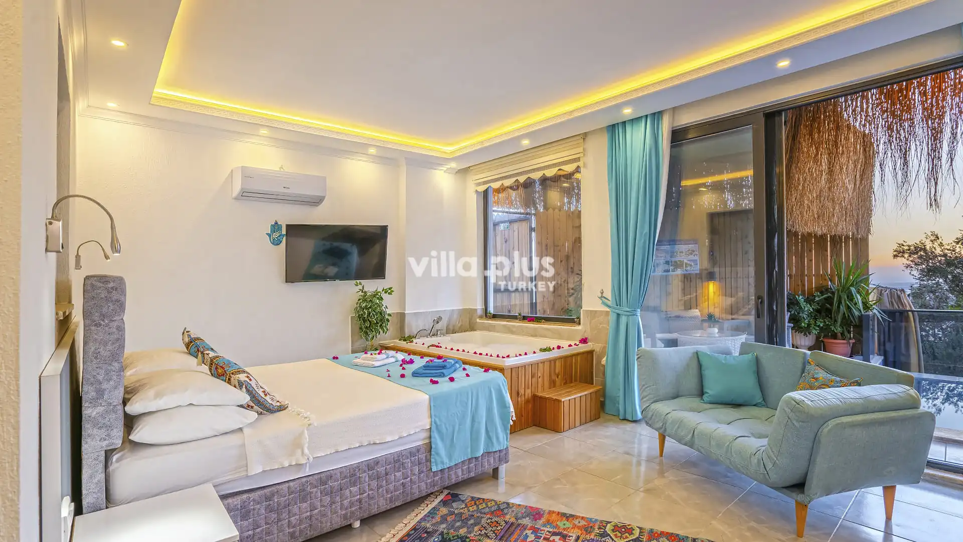 Located in the Üzümlü area of Kalkan, Villa Ginna 2 is a stylish holiday villa specially designed for honeymoon couples, offering accommodation for 2 guests. With its secluded pool area, carefully planned to ensure complete privacy, and an in-room jacuzzi, it combines comfort and intimacy in one perfect setting.