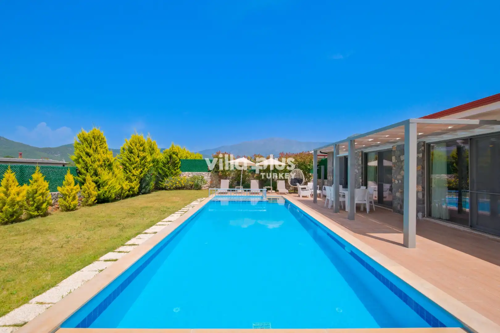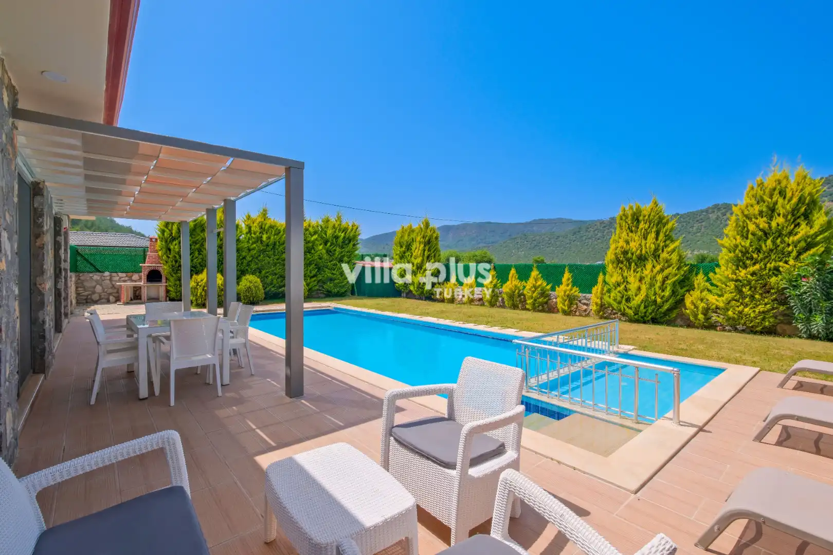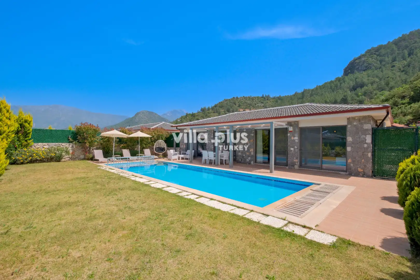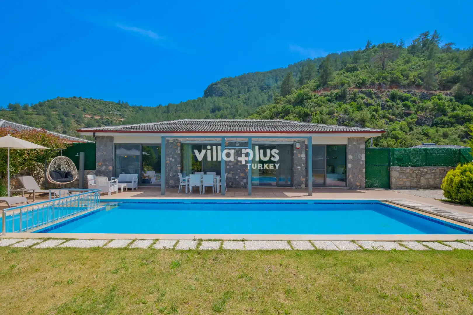 Our villa is located in Kayaköy, one of the boutique and antique villages of Fethiye. It has become one of the popular tourism centers of recent years with its pine and cedar forests surrounding it, hiking trails belonging to the Lycian civilization, and untouched deep blue coves. It offers an isolated holiday experience with its sheltered structure and quiet location for you to spend a holiday alone with your family in nature, away from disturbing eyes.