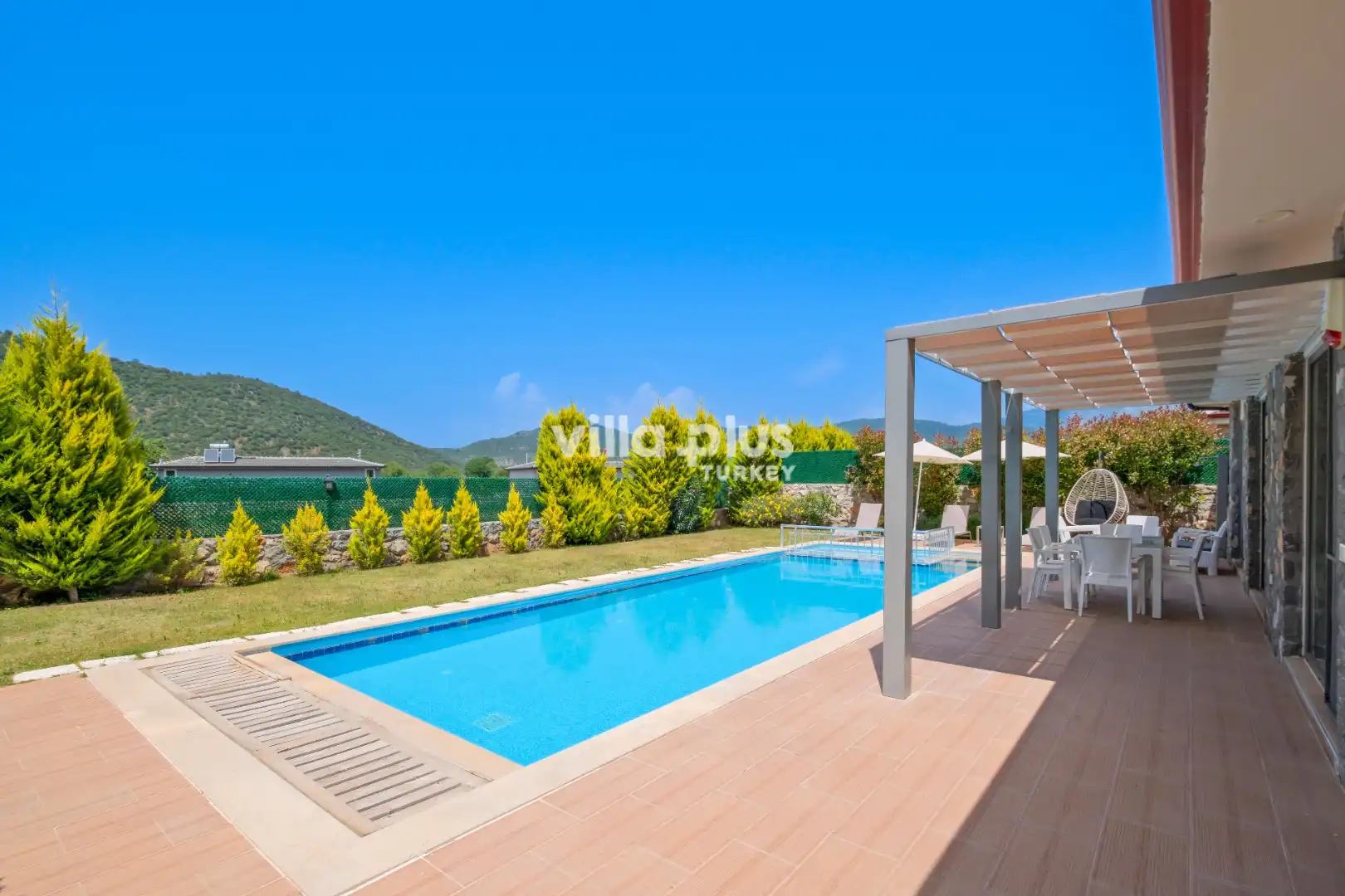 Our villa, which has 2 bedrooms, 2 bathrooms-toilets and 1 kitchen, has an accommodation capacity of 4 people. It has a 32 m2, sheltered pool in nature, a large garden, garden seating, dining table and barbecue. Villa Hale 1 will be honored to welcome you, our valued guests.