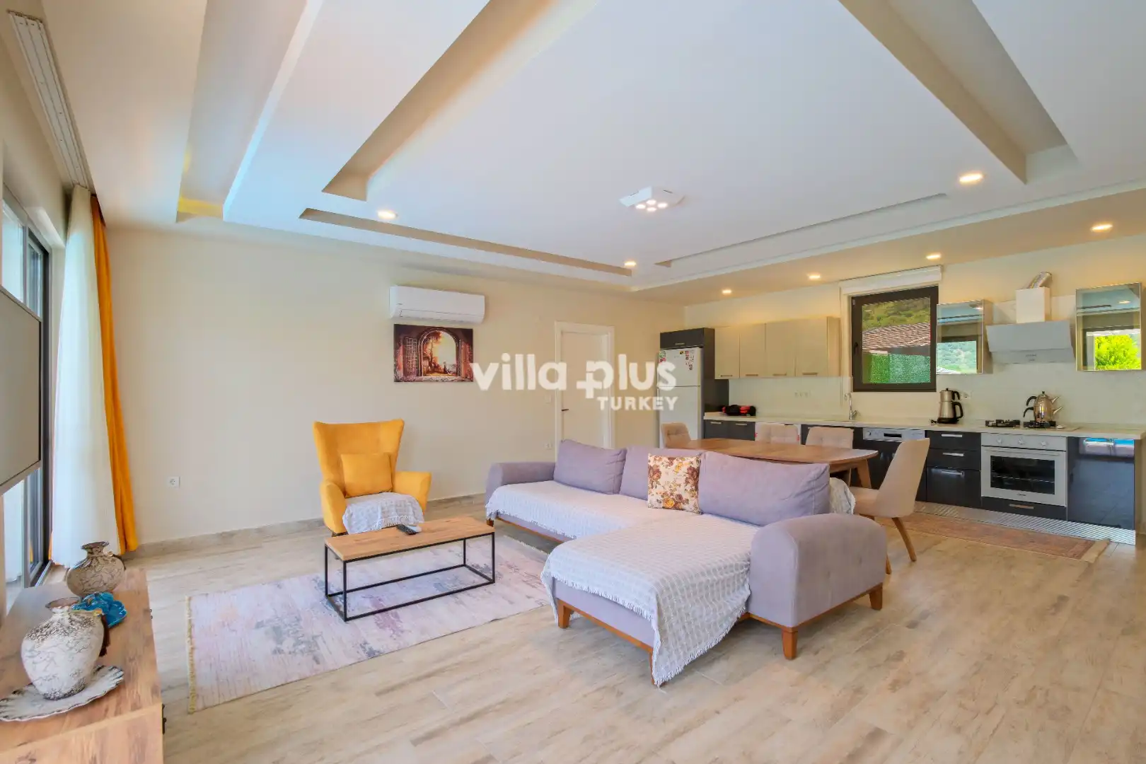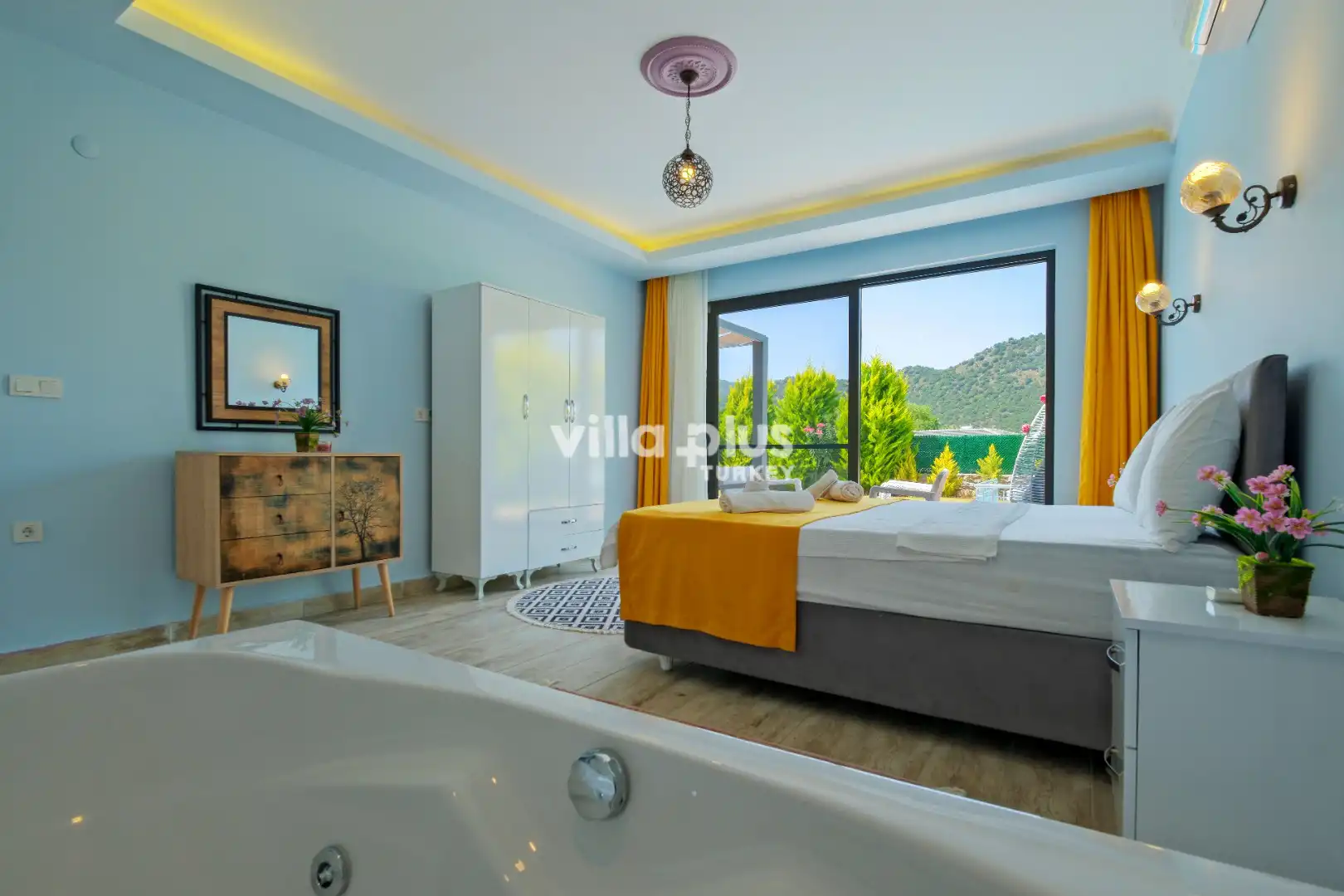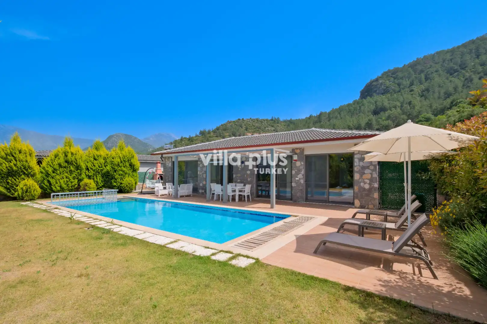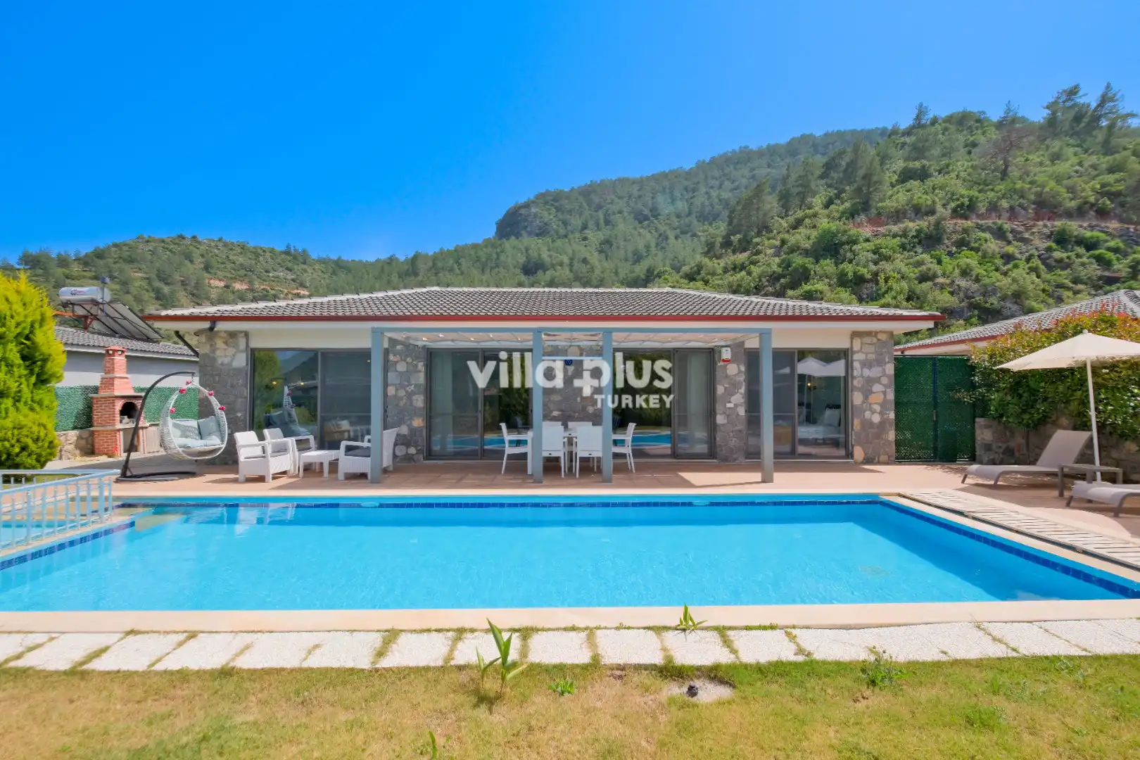 Our villa is located in Kayaköy, one of the boutique and antique villages of Fethiye. It has become one of the popular tourism centers of recent years with its pine and cedar forests surrounding it, hiking trails belonging to the Lycian civilization, and untouched deep blue coves. It offers an isolated holiday experience with its sheltered structure and quiet location for you to spend a holiday alone with your family in nature, away from disturbing eyes.