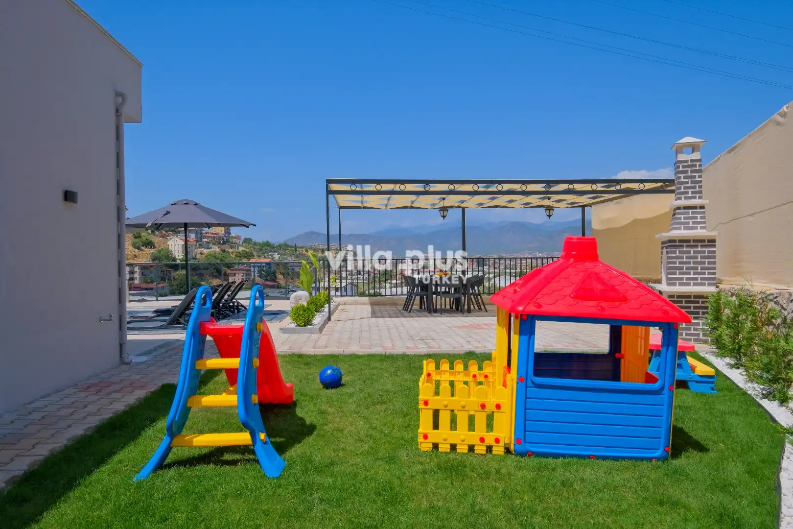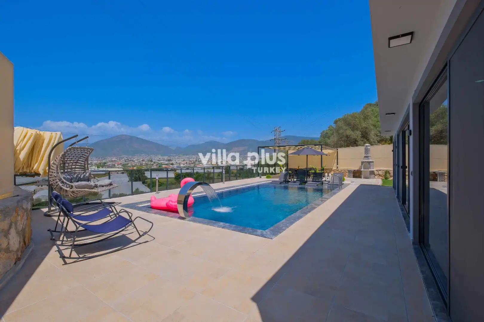 Combining modern design with comfort, the villa meets all your needs at the highest level. The living room opens onto a large pool terrace, providing a relaxing space, while the fully equipped kitchen is designed to make your stay even more enjoyable. Outside, the sun loungers, barbecue area, and swing create an ideal setting for fun and relaxation. One bedroom features a double bed, an en-suite bathroom, and a jacuzzi, while the other bedroom has two single beds and its own en-suite bathroom. With both its interior and exterior spaces, this villa is an excellent choice for guests seeking a comfortable and peaceful holiday.
