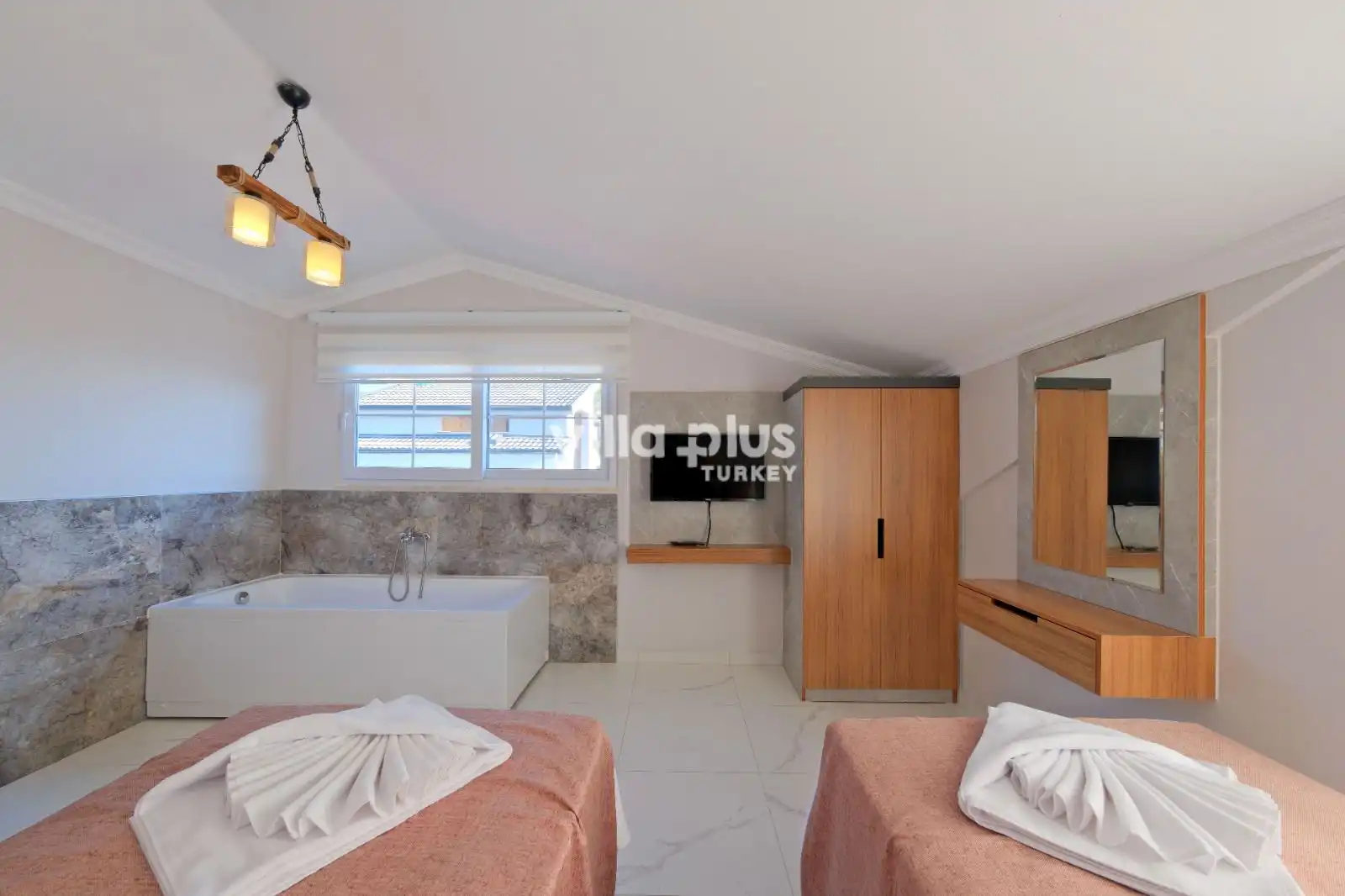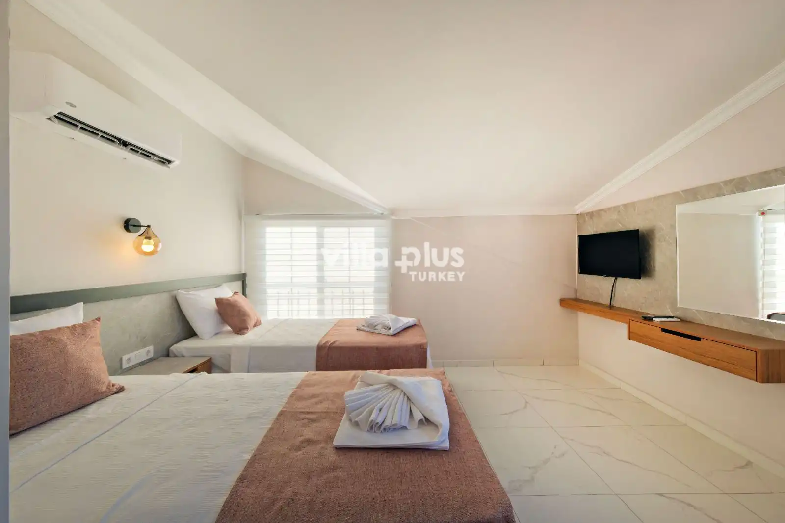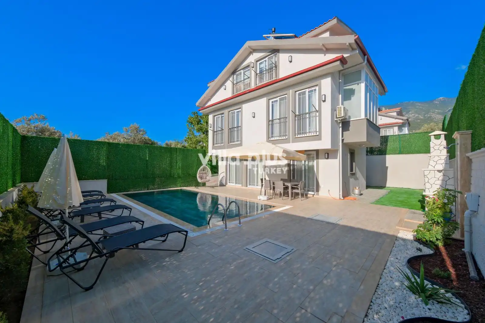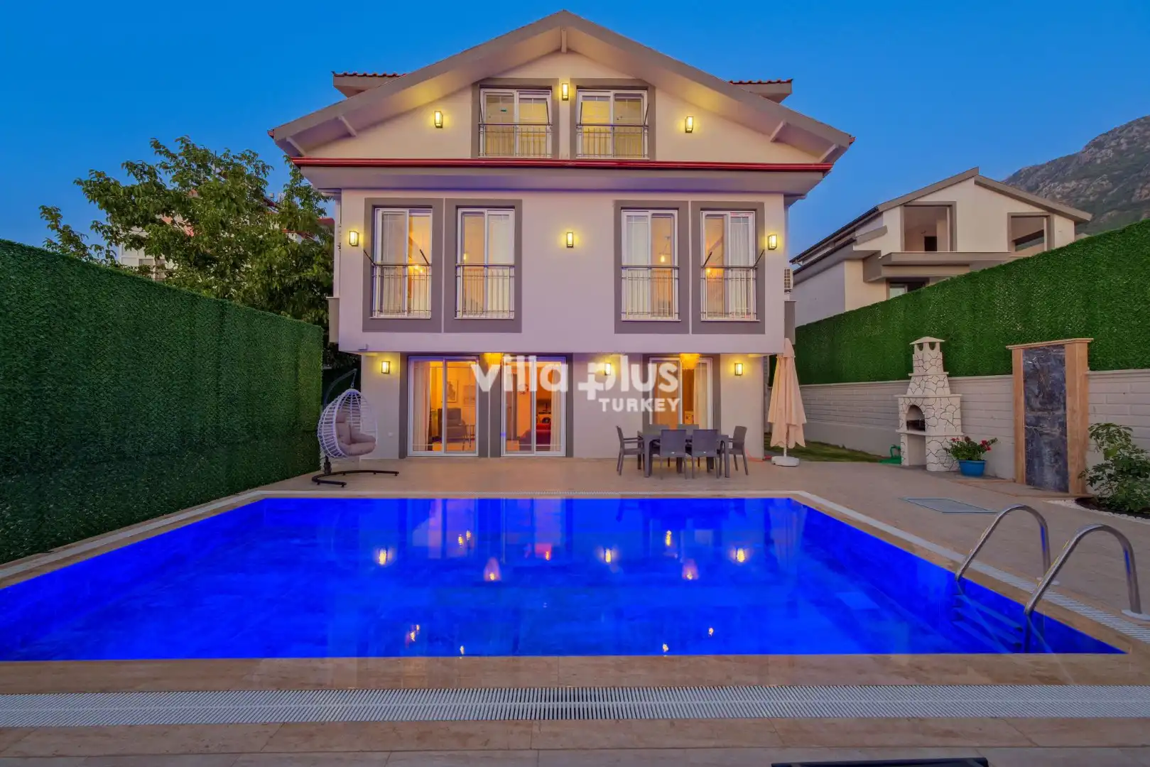 Villa Virtus is a triplex villa located in Hisaronu, Fethiye, a 5-minute drive from Oludeniz Beach. With 4 bedrooms and 4 bathrooms and toilets, our villa stands out as an ideal option for large families and crowded family groups with its accommodation capacity of 8 people. With its sheltered private swimming pool in the large garden area, comfortable sun loungers and indispensable barbecue in the summer months, our villa awaits guests who want to spend a secluded and peaceful holiday.