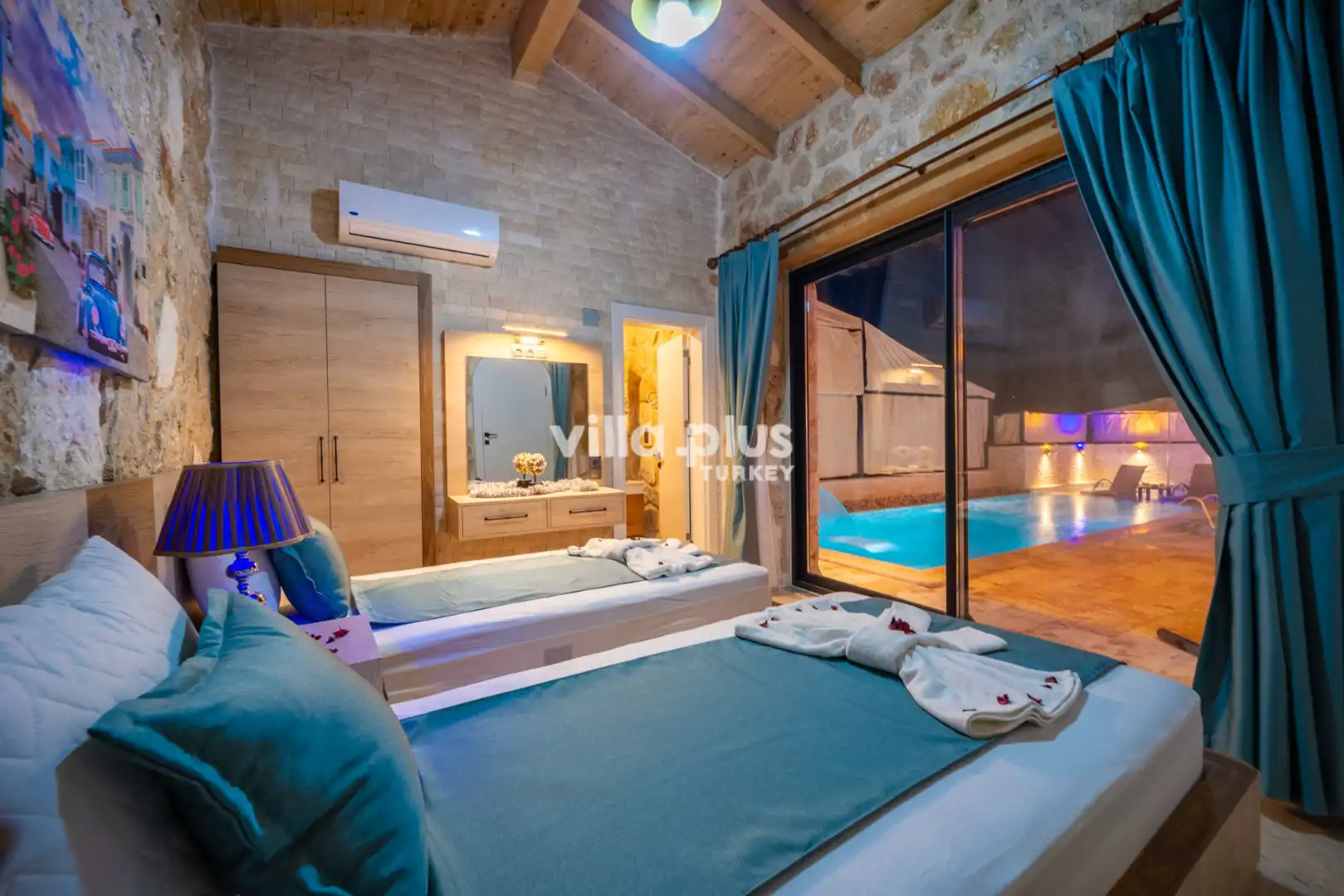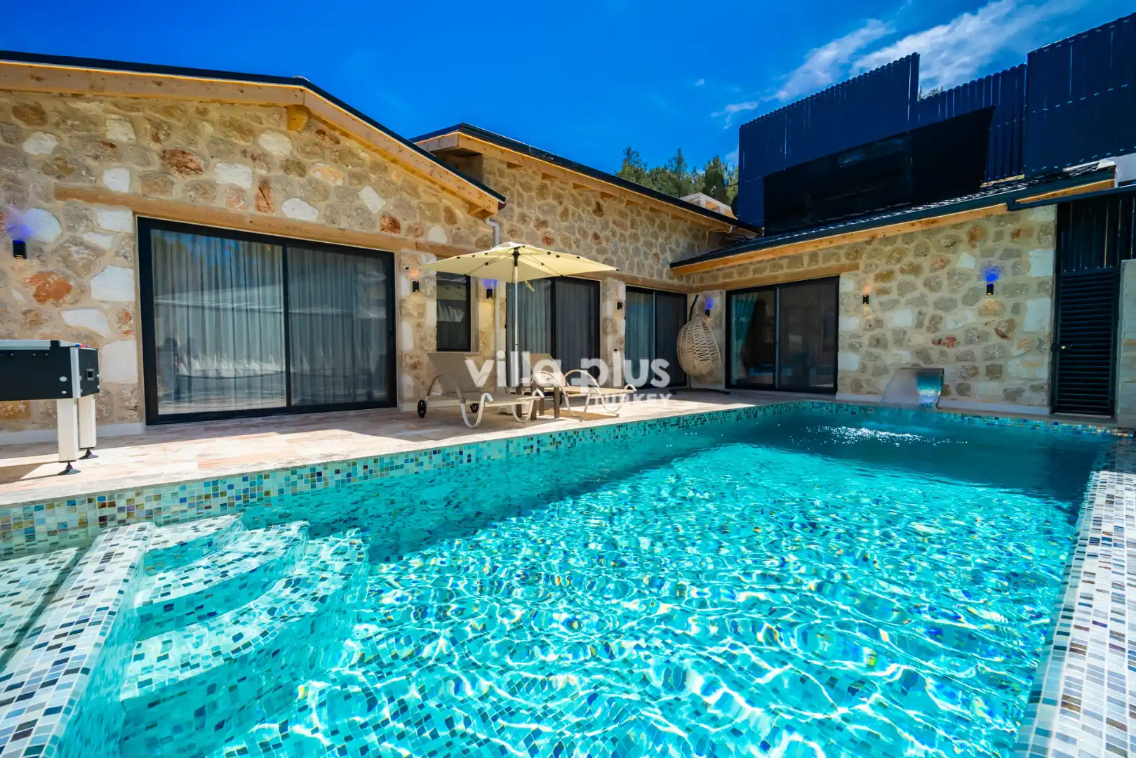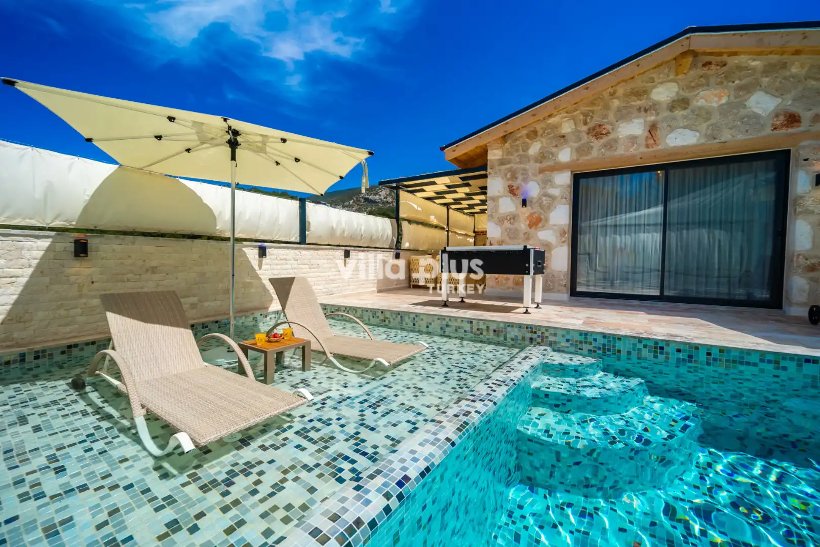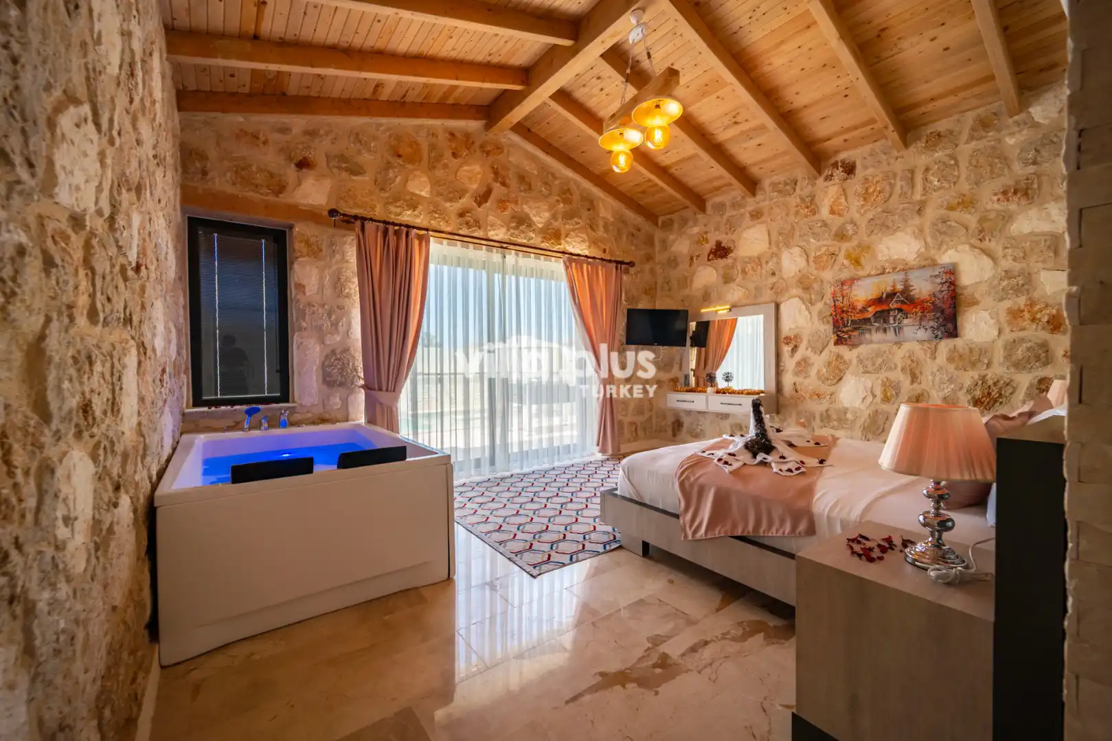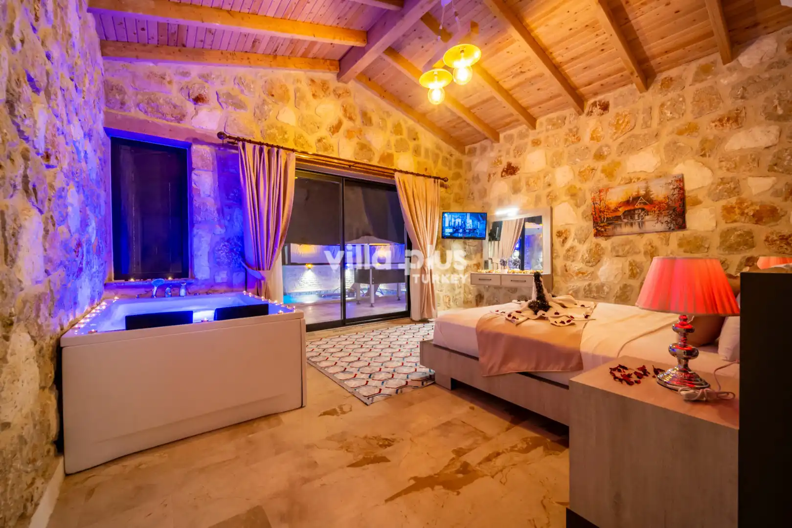 Located in Kalkan's Akbel area, Villa Visvonte Premium offers accommodation for up to 4 people with 2 bedrooms. With its stone and wood architecture, it harmonizes with nature. The pool terrace prioritizes privacy by offering a special atmosphere. The master bedroom features a double jacuzzi.